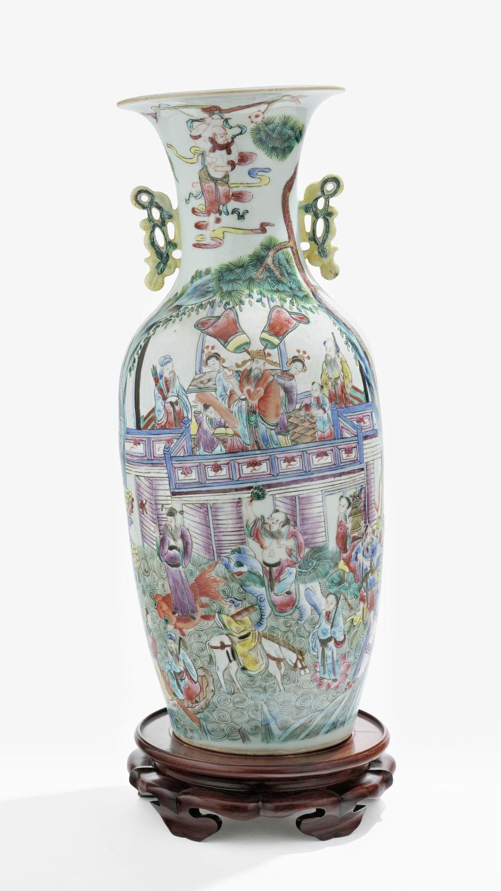 Porcelaine émaillée polychrome et or à décor d'une scène animée, H 58 cm