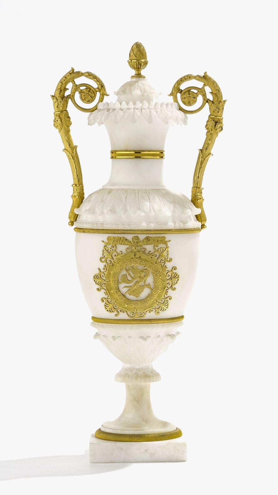 Marbre blanc et bronze doré à décor d'un médaillon ajouré, anses latérales en enroulement, H 39 cm