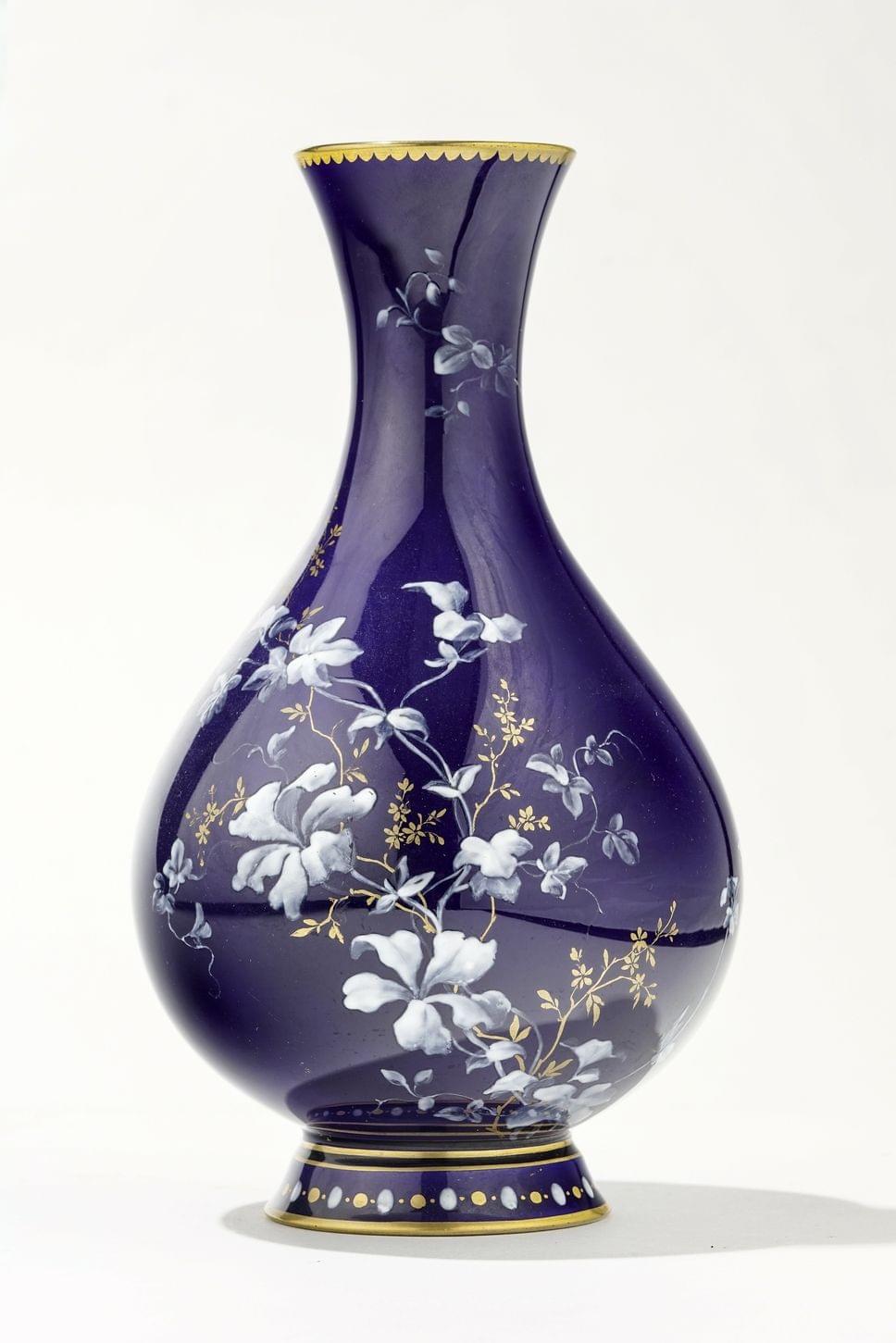 Porcelaine à décor de rameaux fleuris blancs et or sur fond bleu nuit, H 22 cm