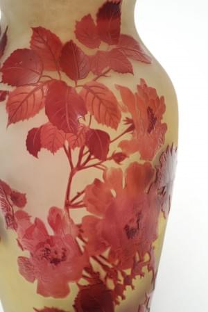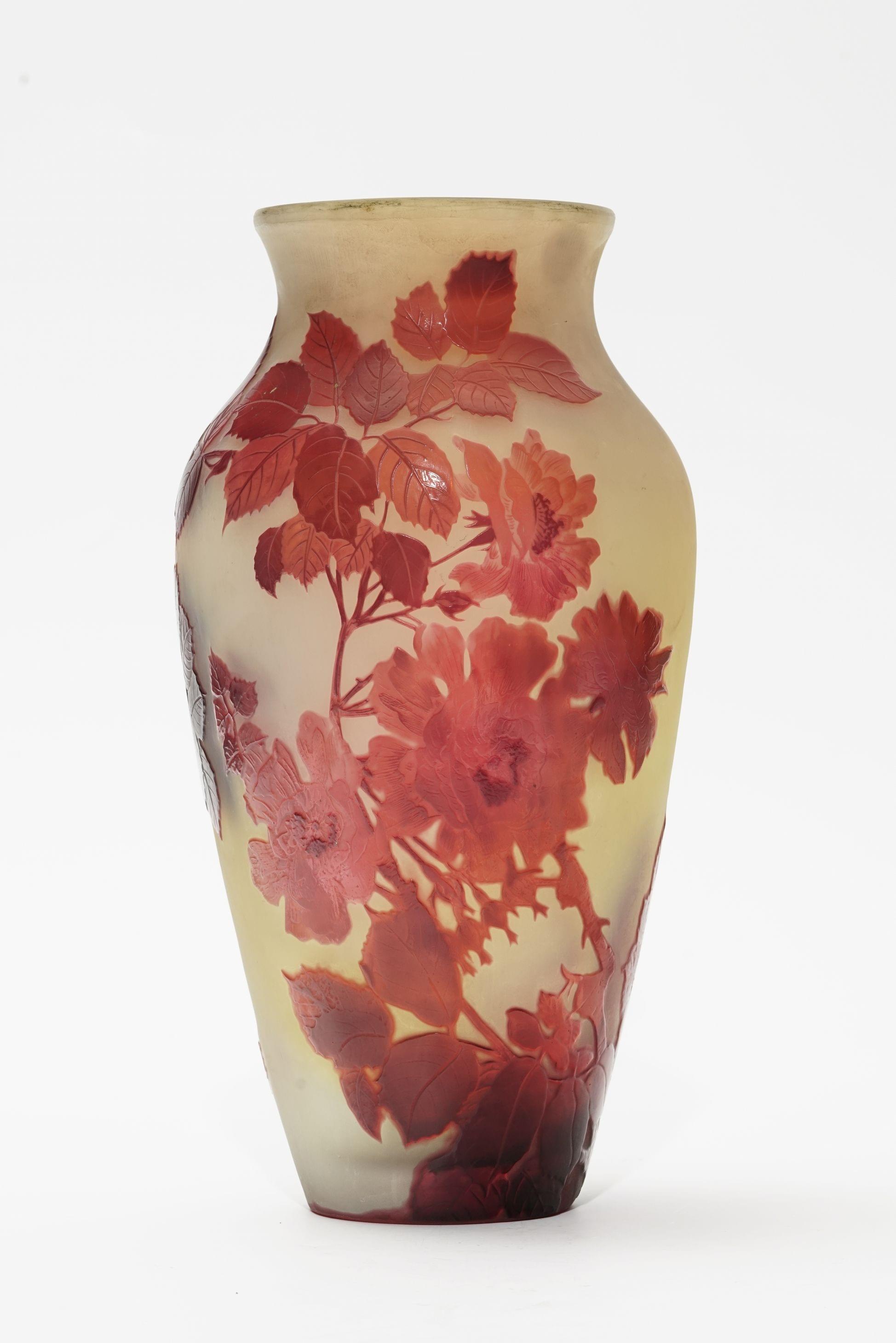Verre multicouche dégagé à l'acide, à décor de roses rouges sur fond laiteux, H 31,5 cm