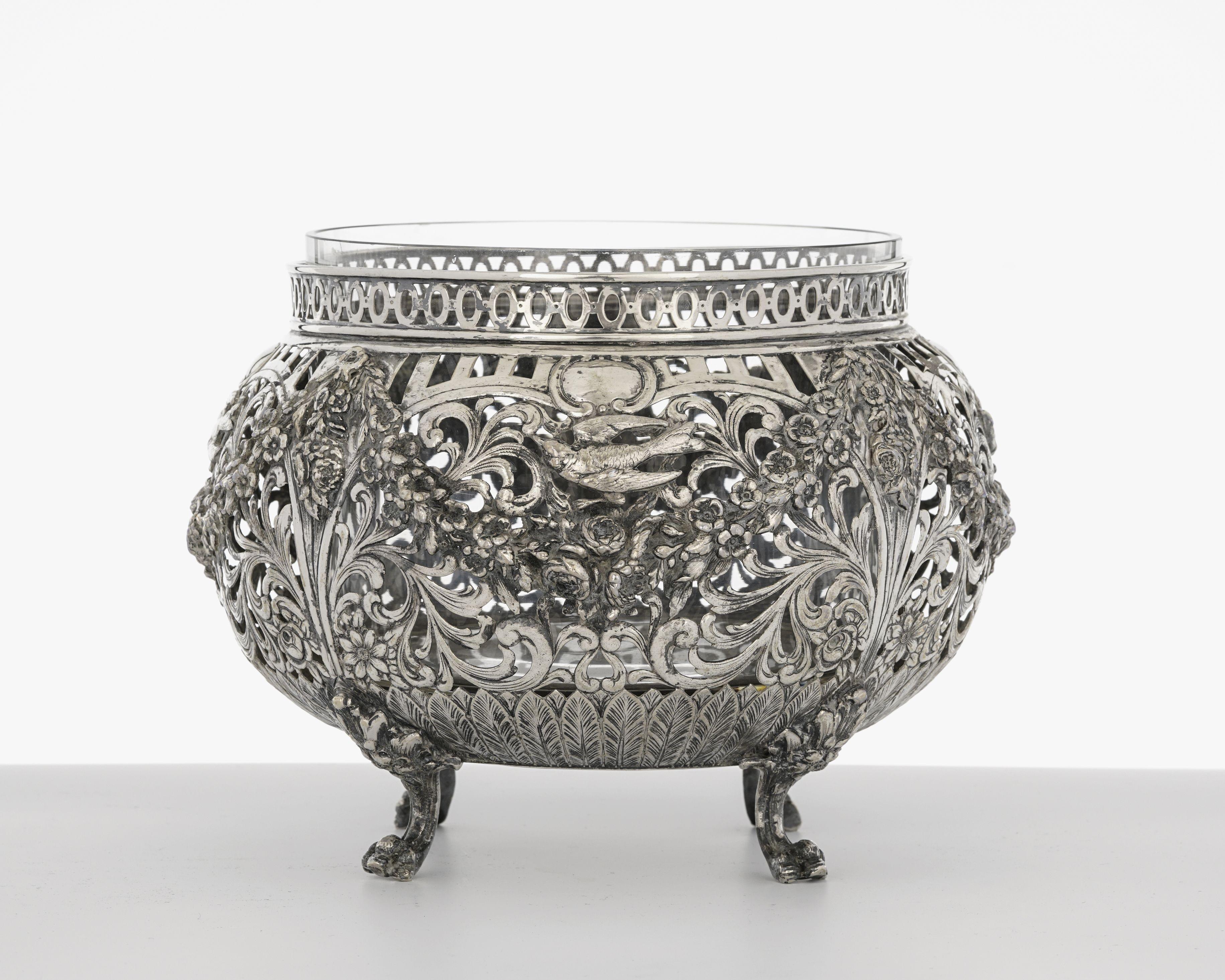 3346. Vase boule dans sa monture ajourée de guirlandes et oiseaux, Allemagne