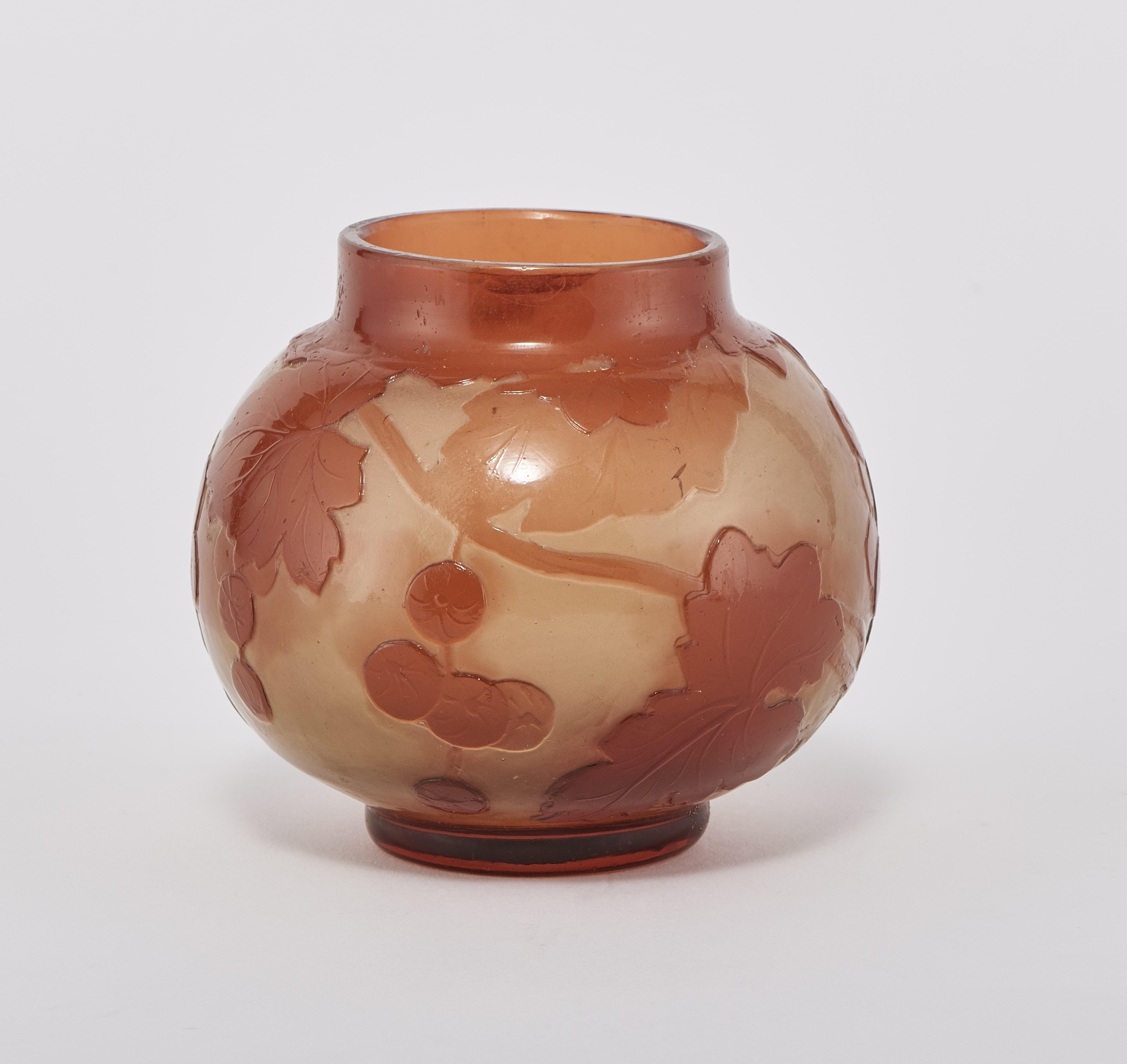 Verre multicouche dégagé à l'acide à décor de feuillage brun sur fond laiteux, H 8 cm