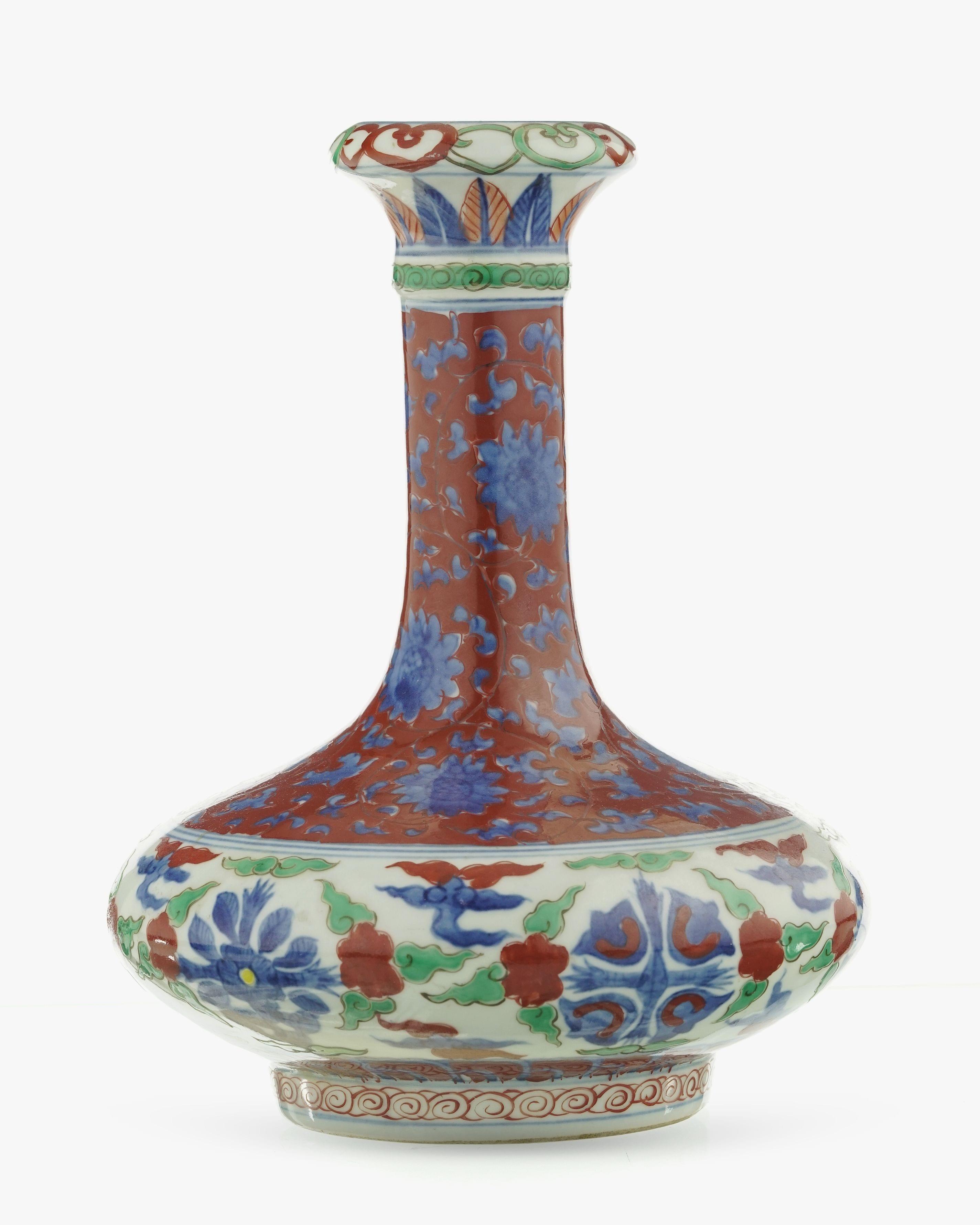 Porelaine émaillée bleu, vert, jaune et rouge à décor de fleurs de lotus, H 23 cm