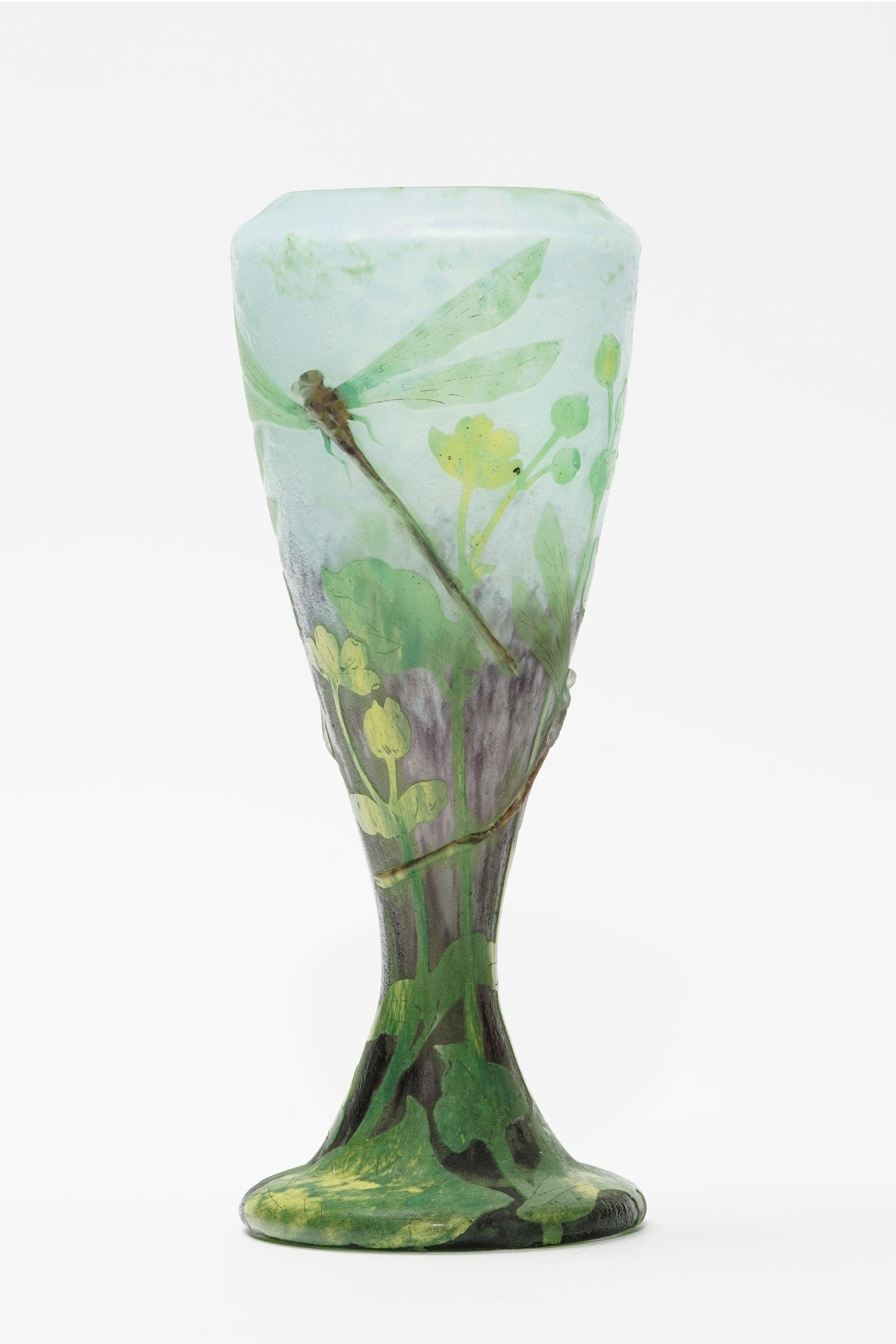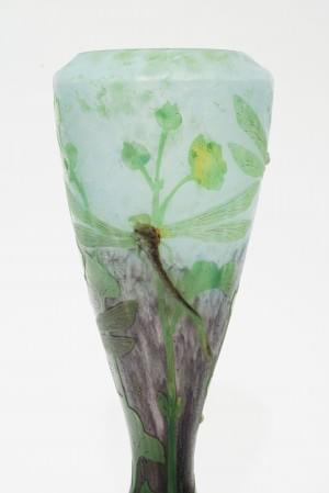 Verre multicouche dégagé à l'acide et travaillé en relief à décor de trois libellules sur fond de feuillage, signé à la pointe, 2362 et 12, H 30 cm