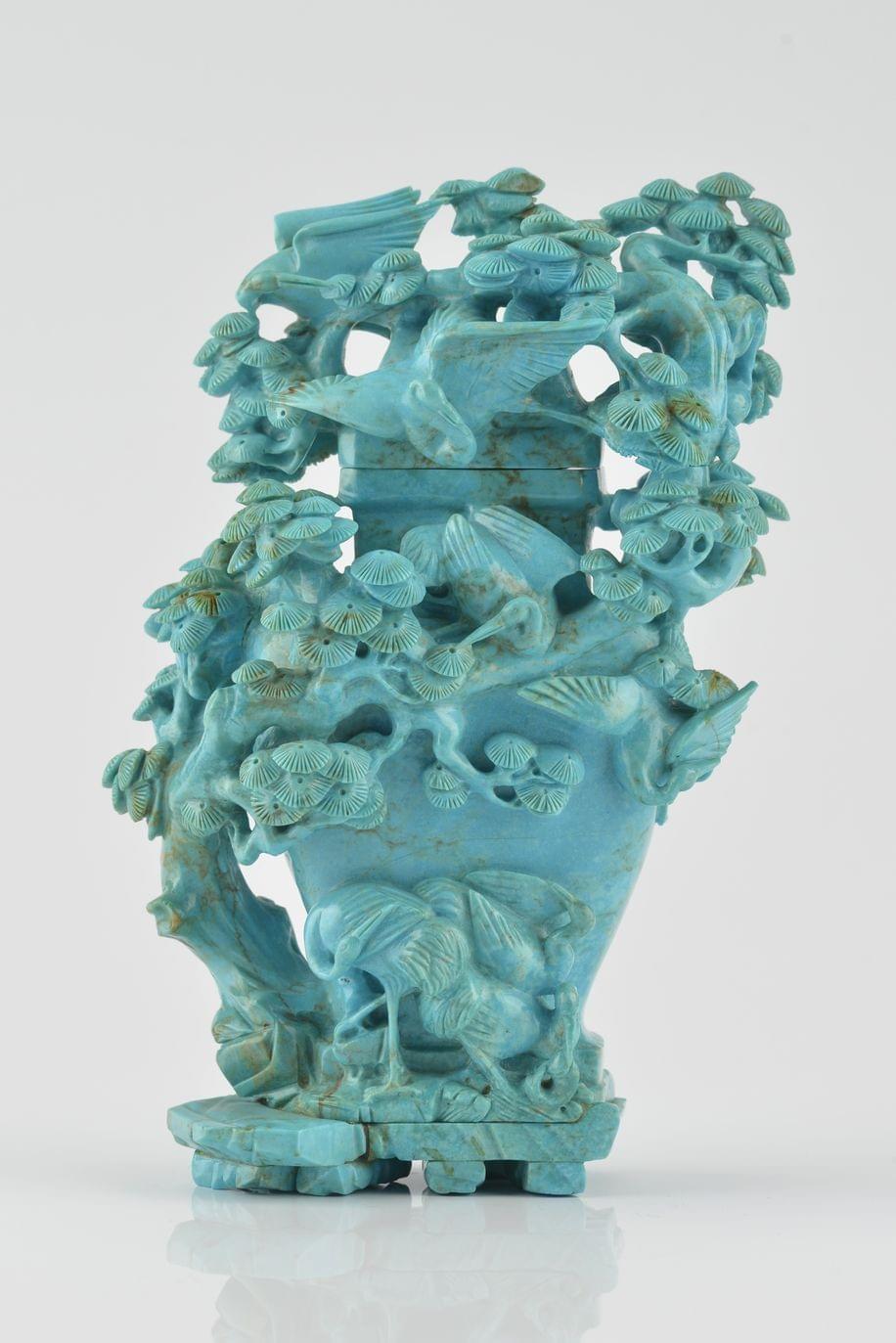 Turquoise sculptée à décor de pins et grues, Chine, XXe s, L 18 cm