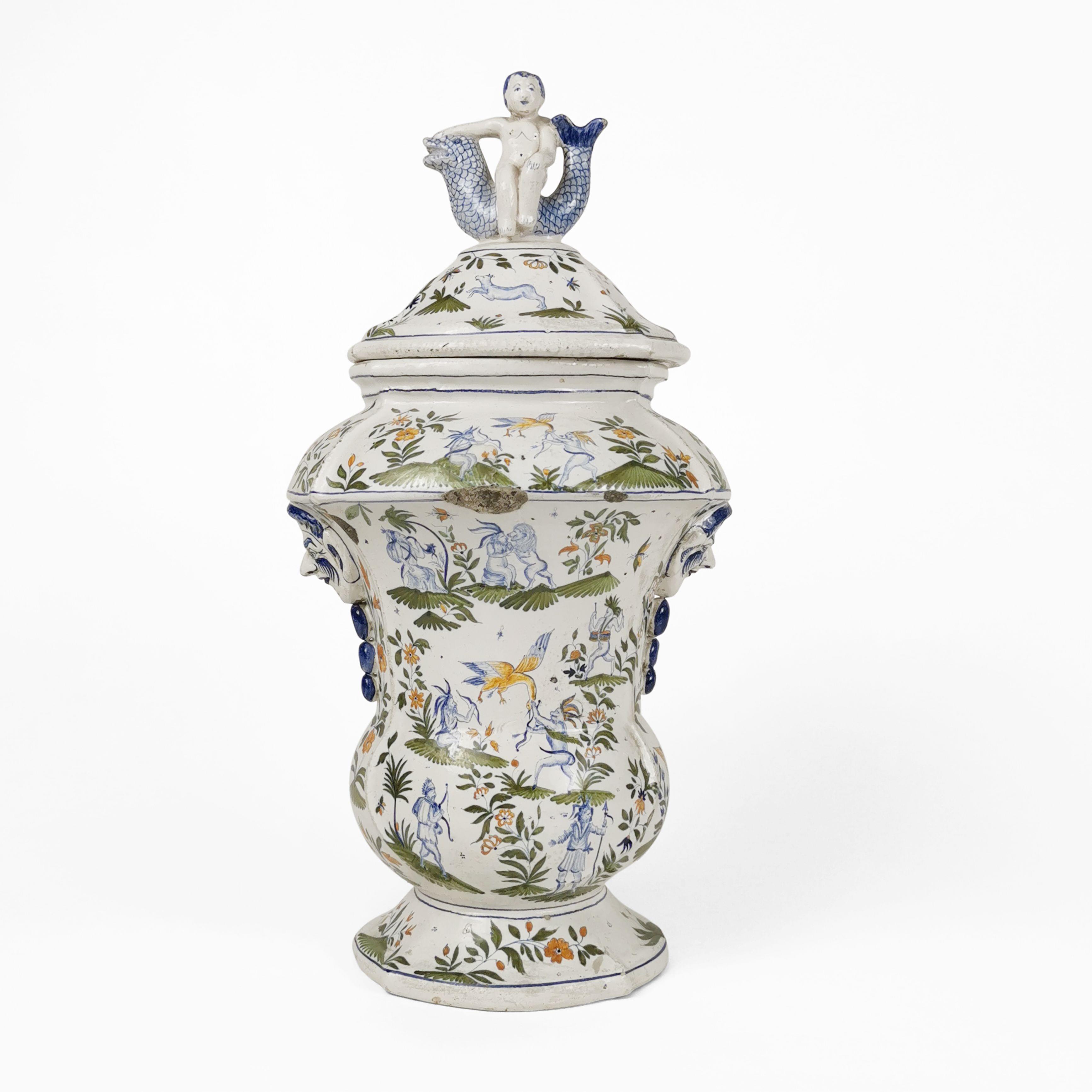 Faïence émaillée polychrome, frétel à motif d'un personnage au poisson, H 39 cm