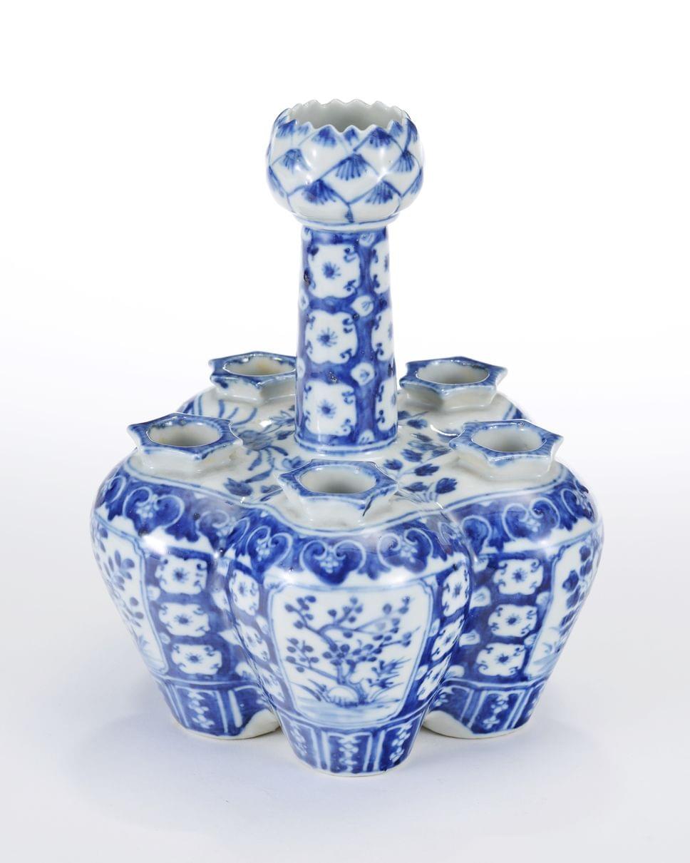 552. Vase crocus à six cols à décor bleu-blanc de pétales de lotus et fleurs