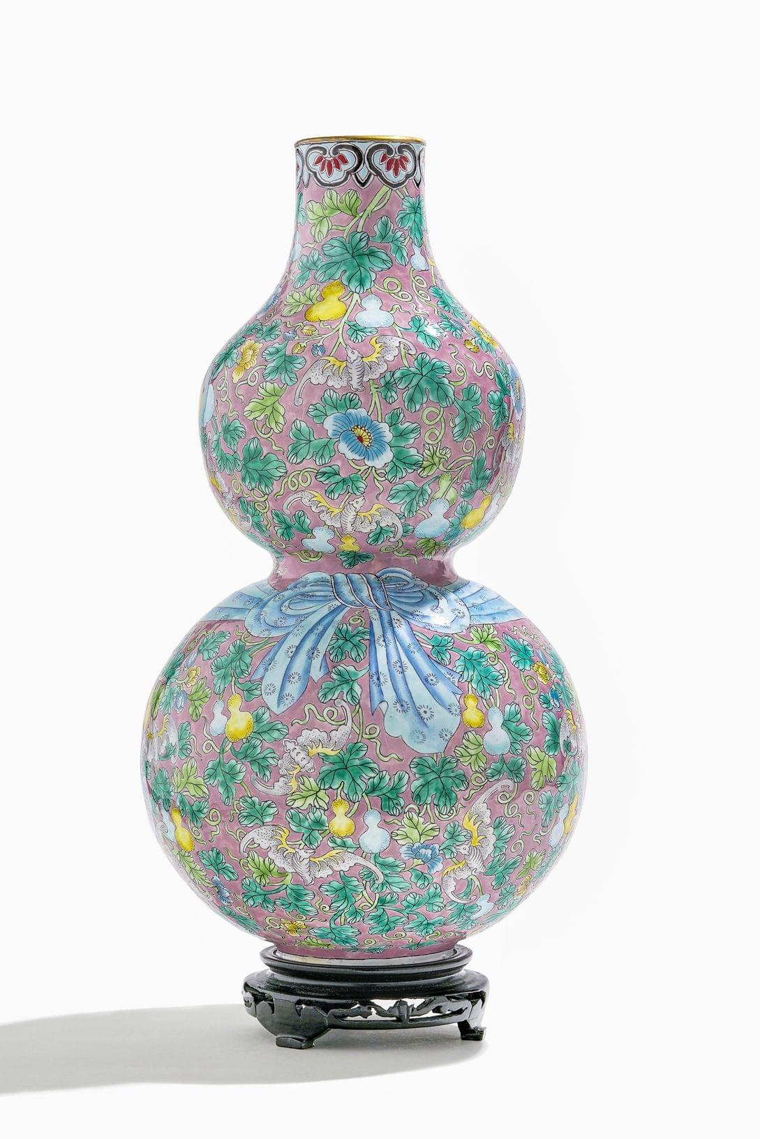 Emaux sur cuivre à décor de chauve-souris, calebasses et fleurs sur fond vieux rose, H 34 cm