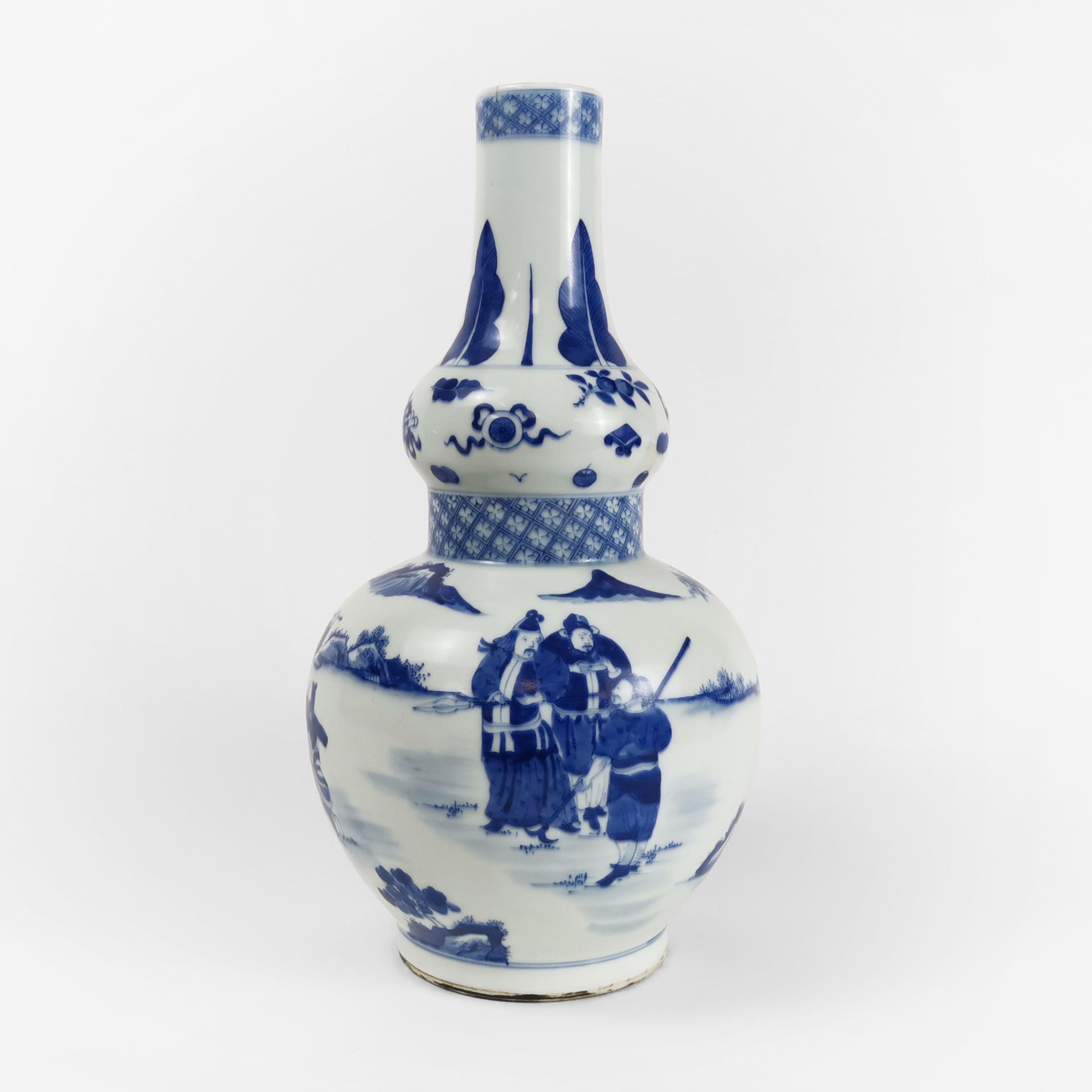Porcelaine émaillée bleu blanc à décor d'un paysage animé de personnages, H 38 cm