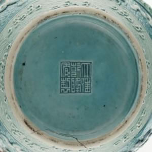 Porcelaine à décor de cinq dragons en relief sur fond turquoise, les yeux et la langue amovibles, H 22 cm