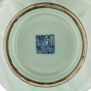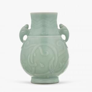 Porcelaine à engobe céladon le corps à décor en faible relief de dragons et courbes entrelacées, le col de motifs sinueux et de motifs ruyi, anses latérales, H 20,5 cm. Selon la tradition familiale, ancienne collection du Dr. Alessandro Gomelsky jusqu’à sa mort à Locarno en 1964, puis de son fils le producteur de musique Giorgio Gomelsky (1934-2016); acquis auprès de ce dernier par l’actuel propriétaire.