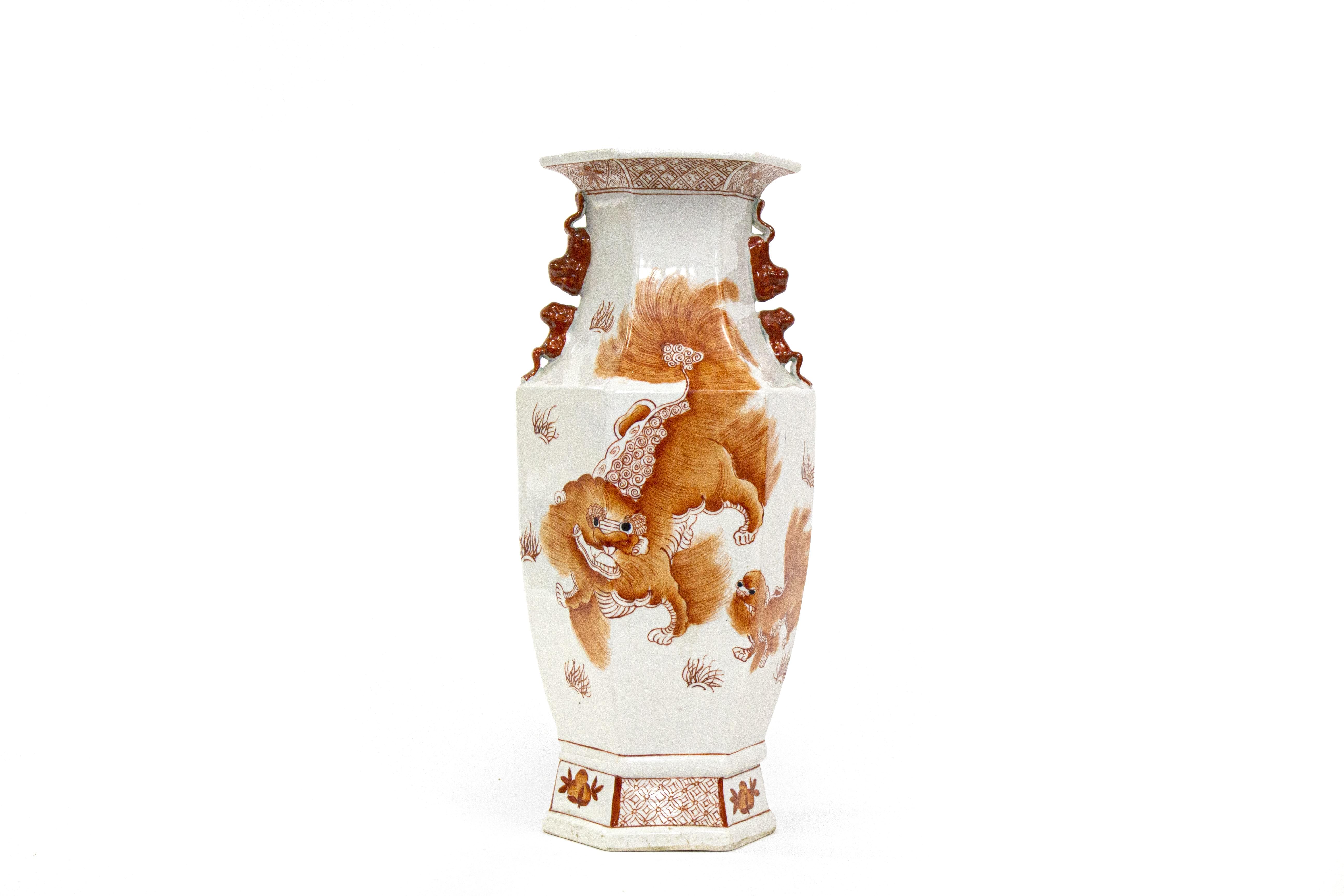Porcelaine émaillée rouge de fer à décor de chiens de Fô, H 42 cm