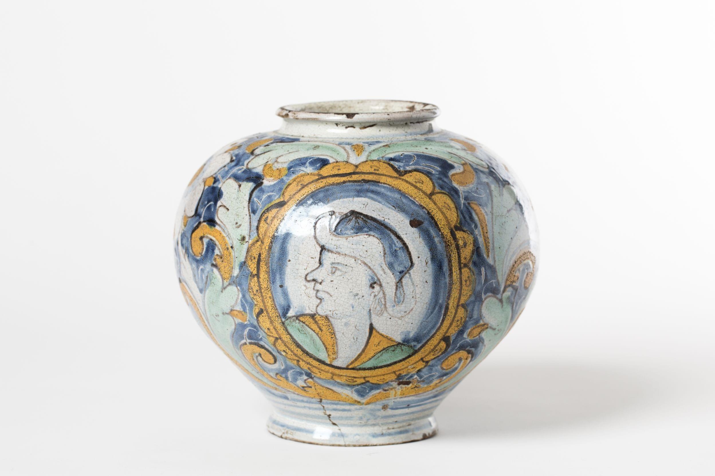 Faïence émaillée polychrome à décor d'un personnage dans un médaillon entouré de fleurs, H 24 cm