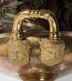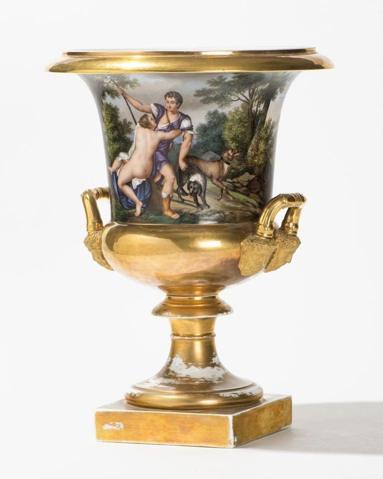 Porcelaine à décor peint d'une scène animée en réserve, fond or, H 40 cm