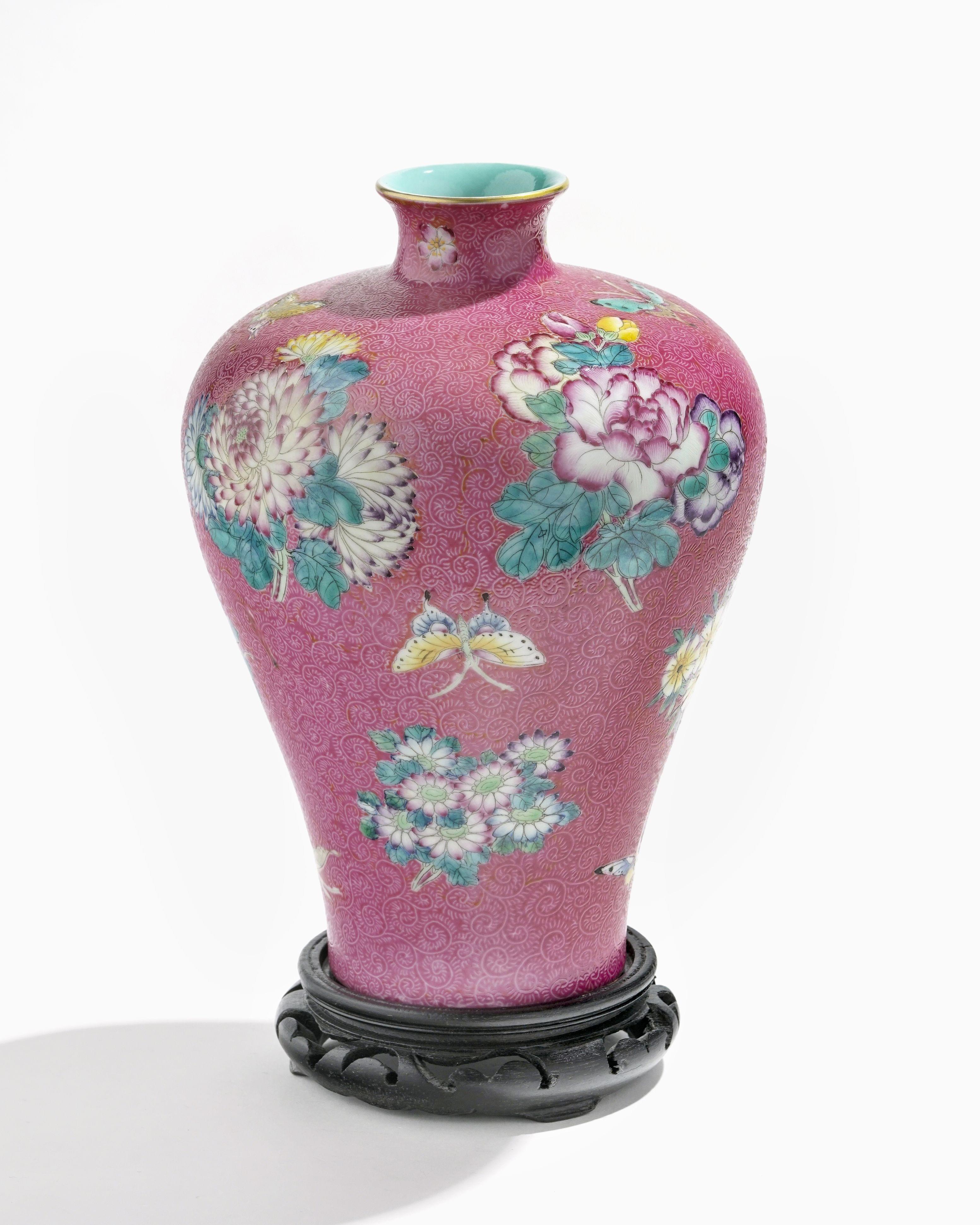 Porcelaine émaillée polychrome à décor de fleurs et papillons sur fond rose en graviata, H 23,5 cm