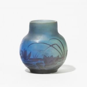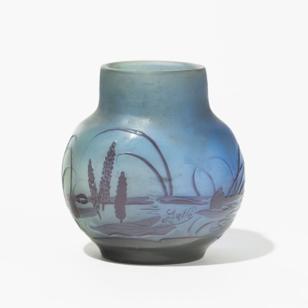 Verre multicouche dégagé à l'acide à décor de nénuphars bleu marine sur fond bleu clair, H 9, 5 cm
