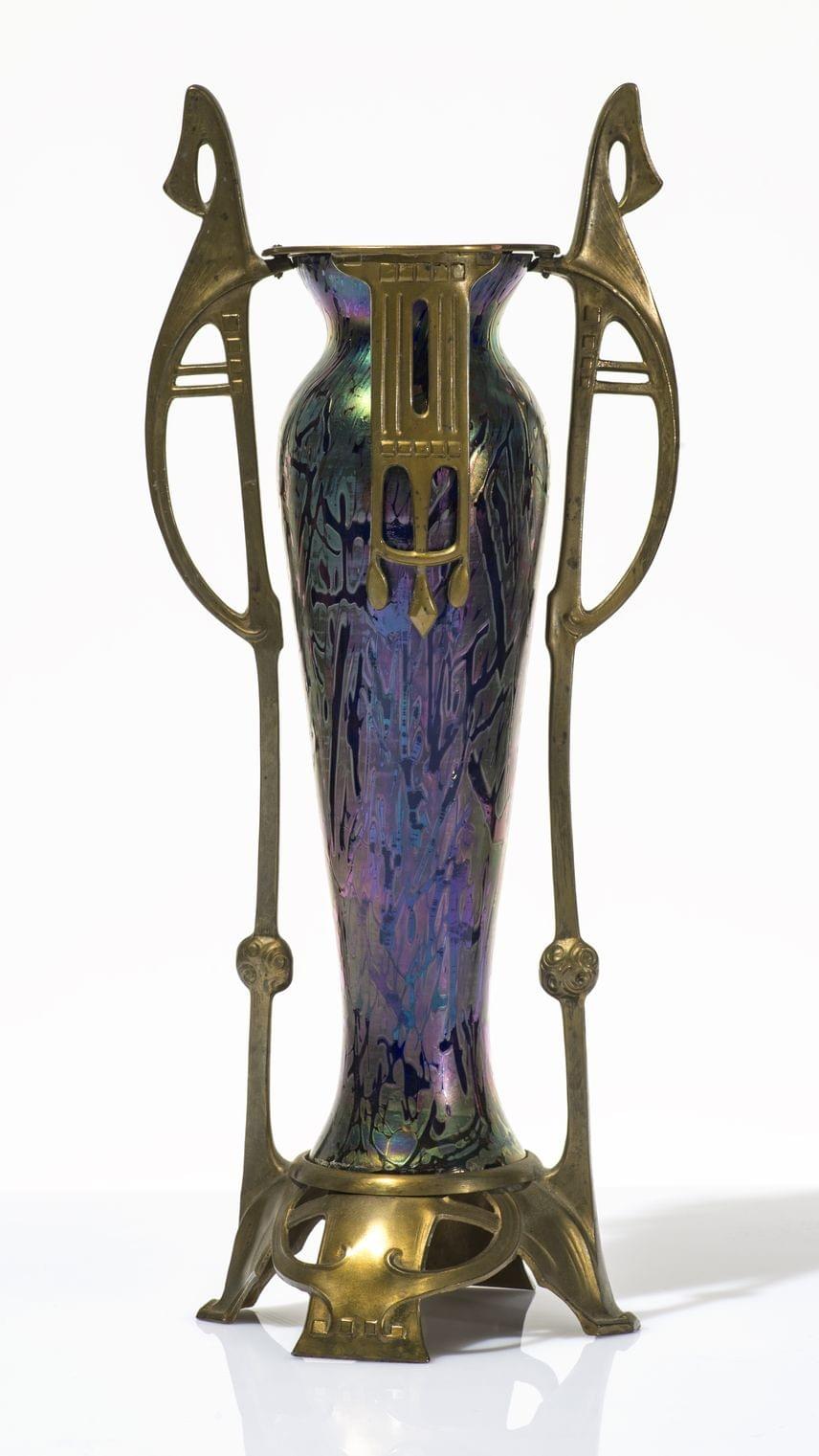 129. Petit panier à anse amovible et décor Art Nouveau de fleurs et i...