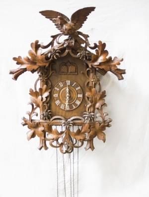 Bois sculpté à décor de feuilles et fleurs, poids pommes de pin,...