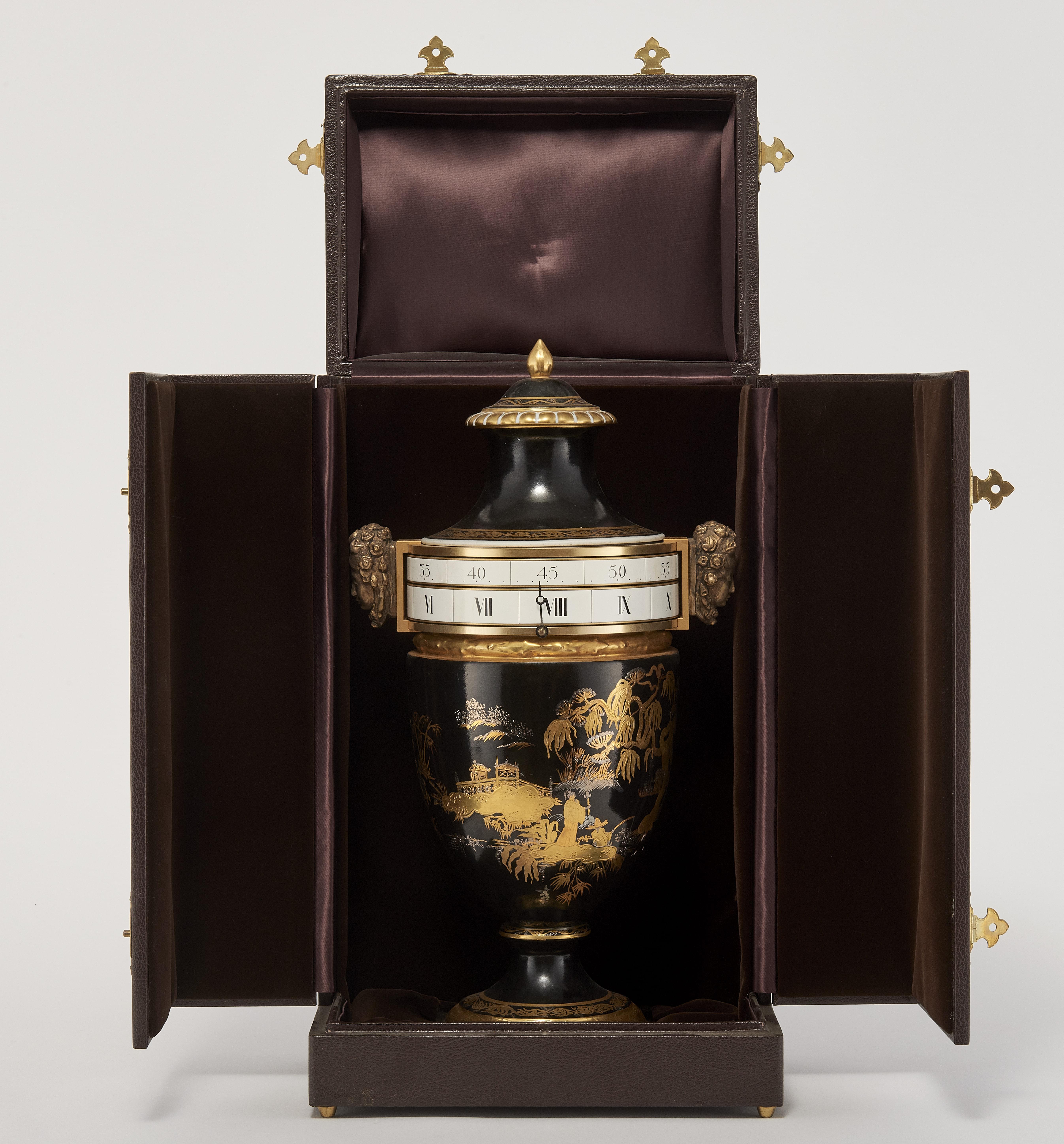896. Vase néoclassique formant pendule tournante à décor doré au chinois sur fond noir
