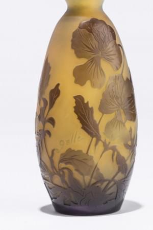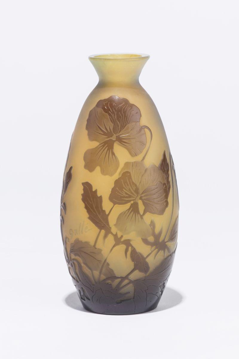 Verre multicouche dégagé à l'acide à décor de pensées mauves sur fond vert, H 15 cm