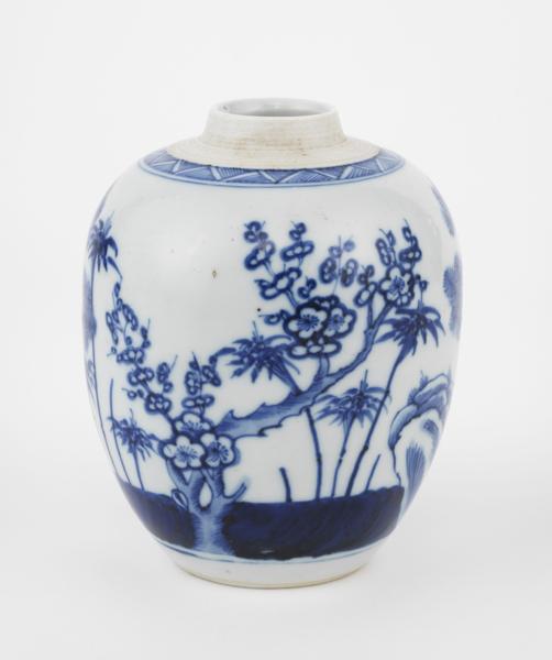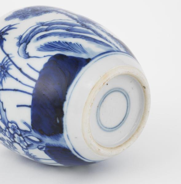 Porcelaine émaillée bleu blanc à décor des trois amis (pins, prunus et bambous), H 14 cm