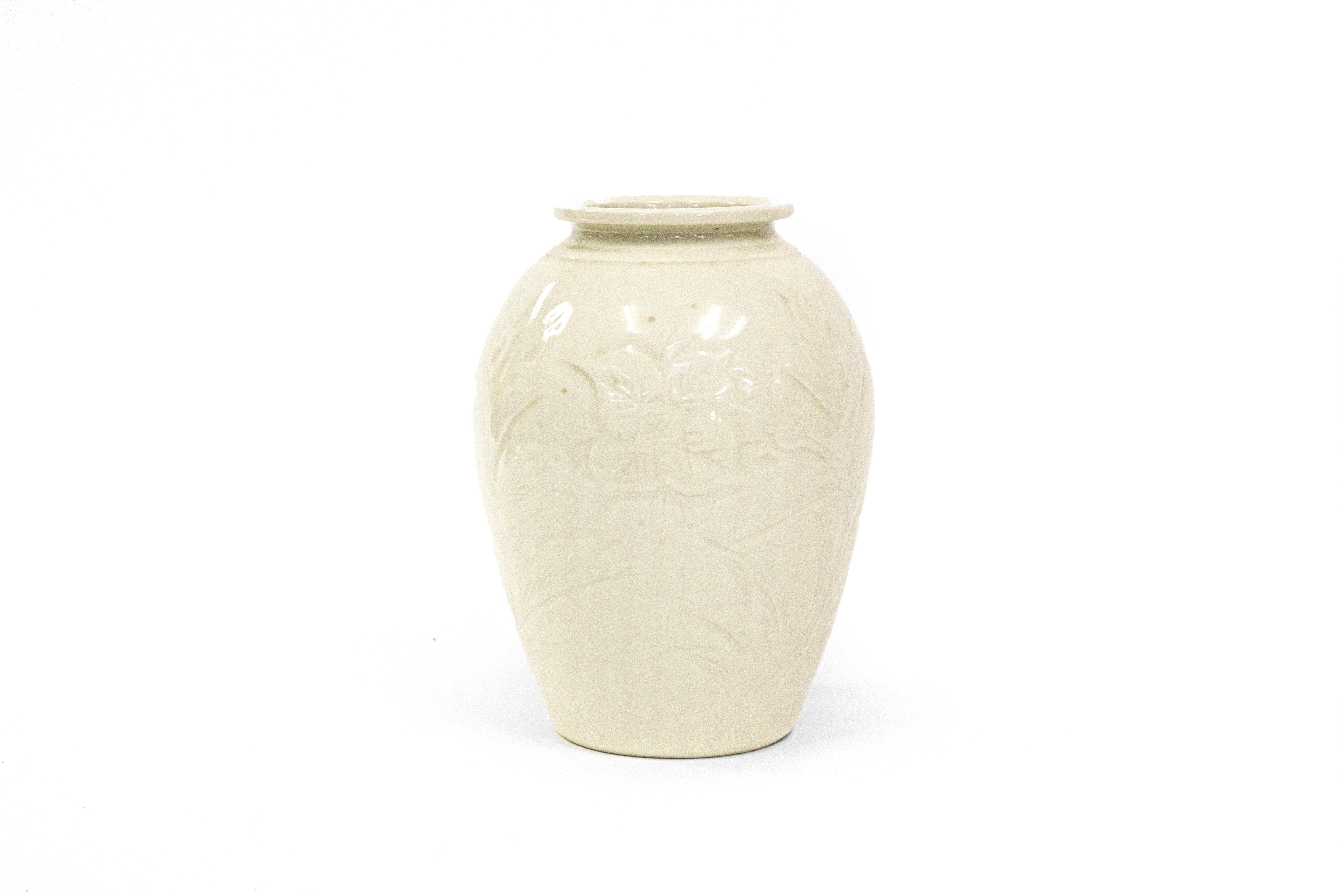 Porcelaine émaillée bleu blanc à décor incisé de motifs floraux,...