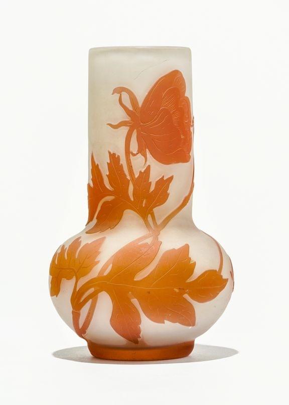 Verre multicouche dégagé à l'acide à décor d'anémones orange sur fond laiteux, H 15,5 cm. Provenance: Château fribourgeois