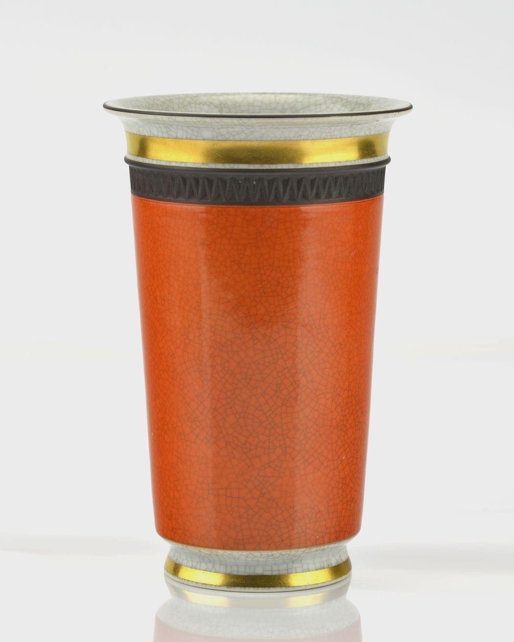 Porcelaine émaillée corail à craquelures et rehauts de filets dorés, bande de rais de coeur en noir au col, cachet de la manufacture, numéroté 751/4225, H 18 cm