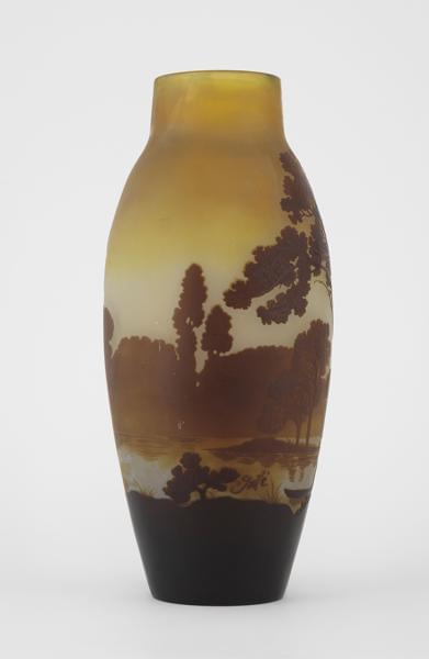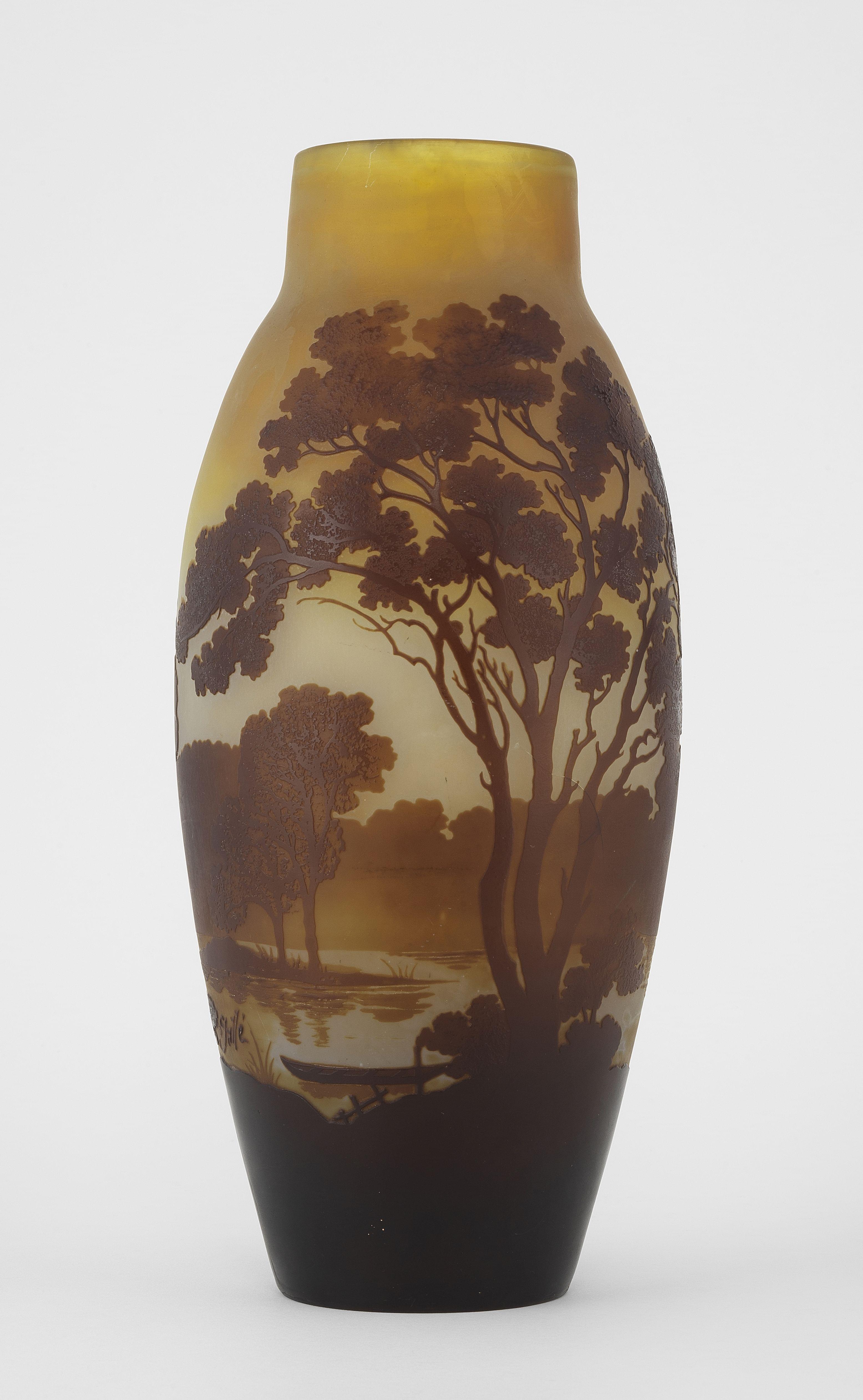 Verre multicouche dégagé à l'acide à motif d'un paysage lacustre brun sur fond marmoréen, H 32 cm