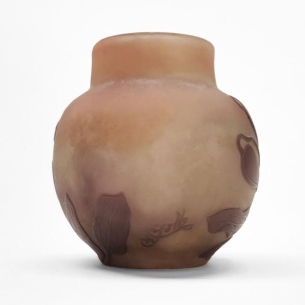 Verre multicouche dégagé à l'acide à décor de violettes sur fond laiteux, H 9 cm