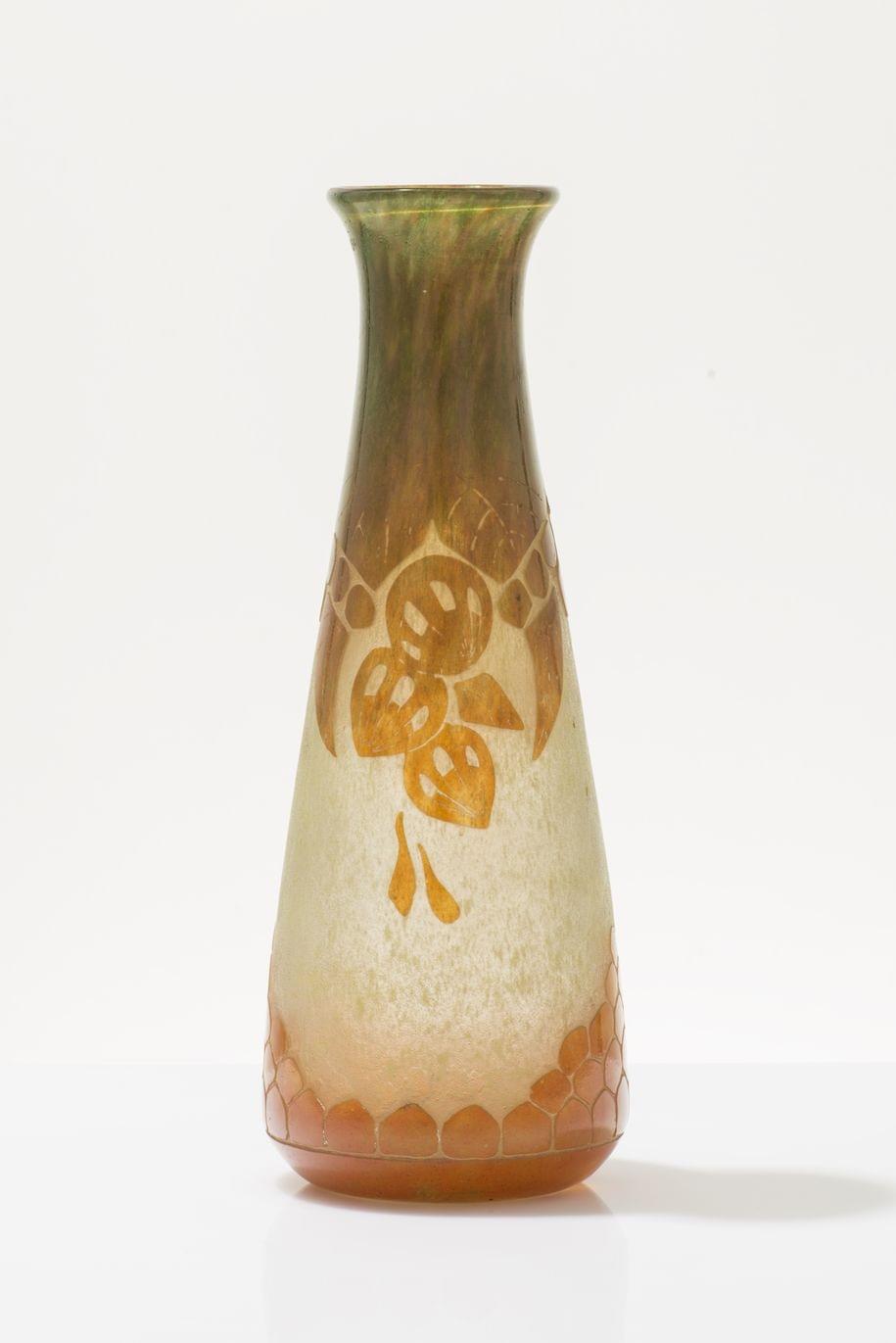 Verre multicouche dégagé à l'acide à décor stylisé de fleurs oranges sur fond laiteux, H 40 cm