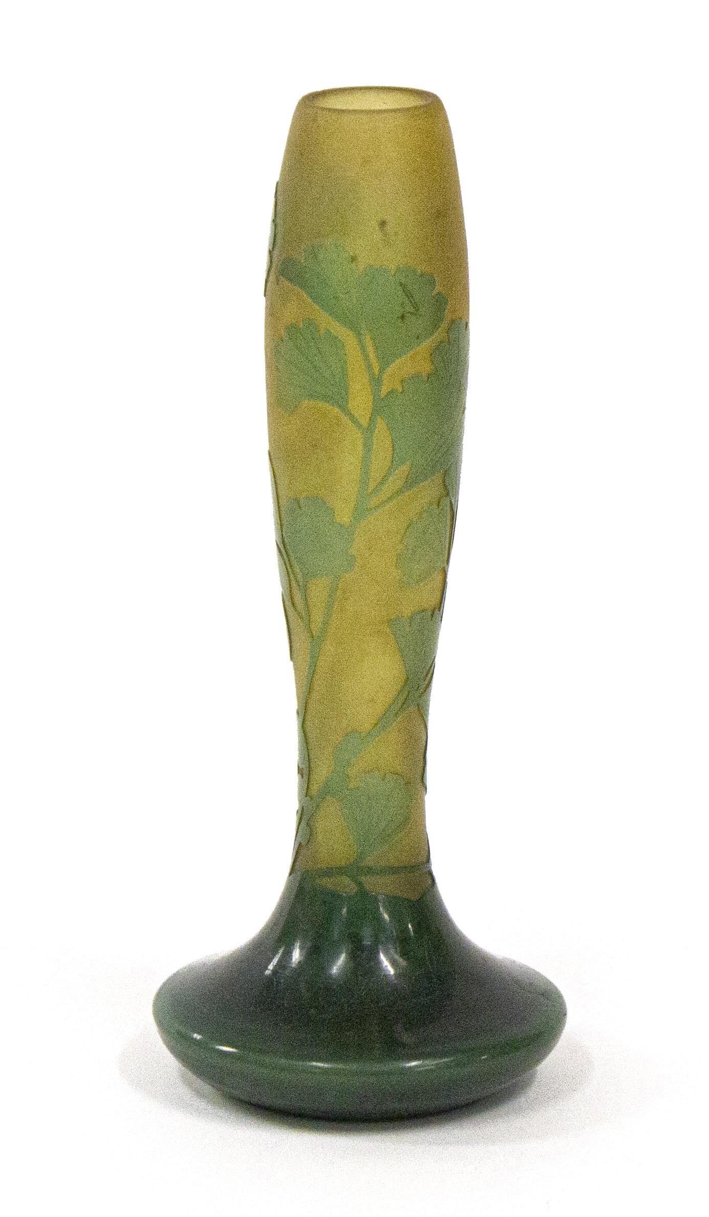 Verre multicouche dégagé à l'acide à décor de branches de ginko sur fond laiteux, H 15 cm