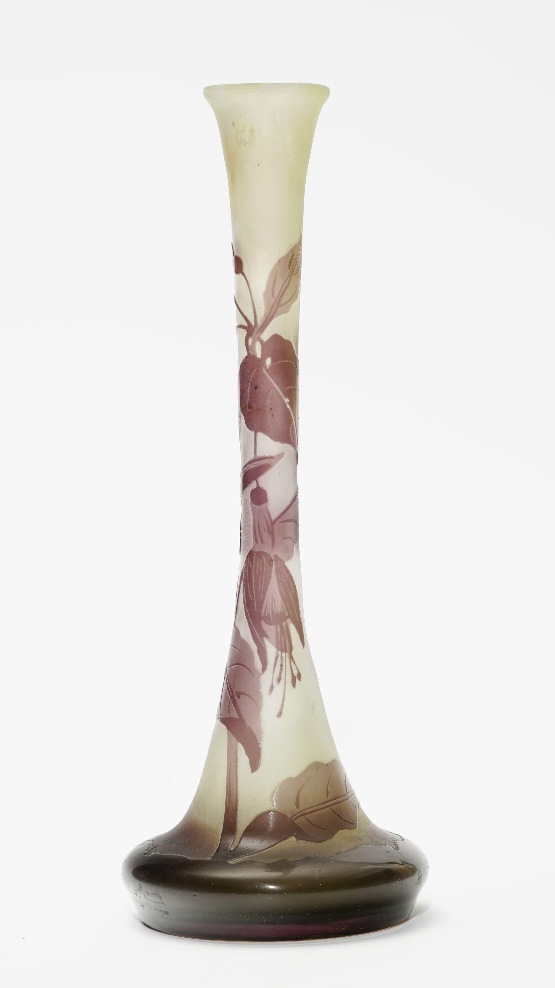 Verre multicouche dégagé à l'acide à décor de fleurs violettes sur fond laiteux, H 24 cm