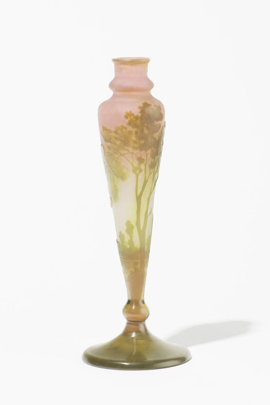 Verre multicouche dégagé à l'acide à décor d'un paysage lacustre vert et brun sur fond rose, H 29 cm