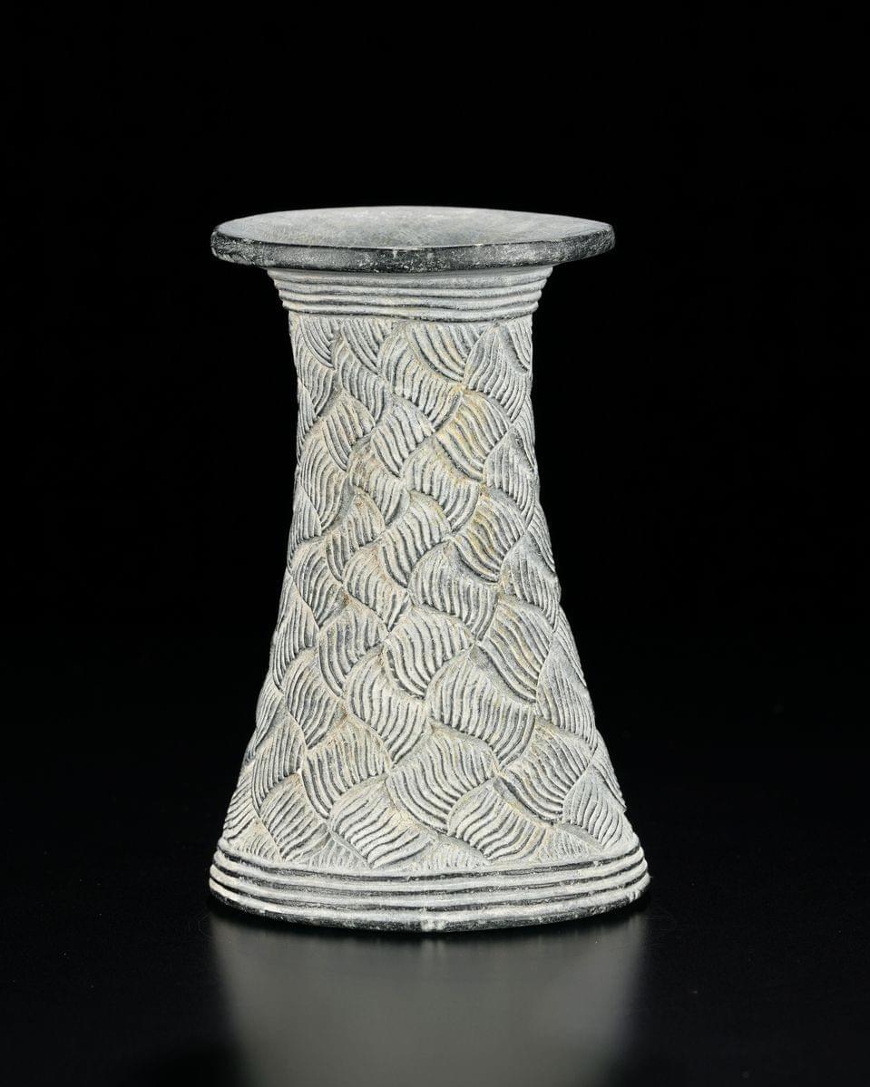 Chlorite sculptée, H 10 cm. Un vase de même forme et d'un décor quasi identique est conservé au musée du Louvre. Provenance: Collection privée suisse