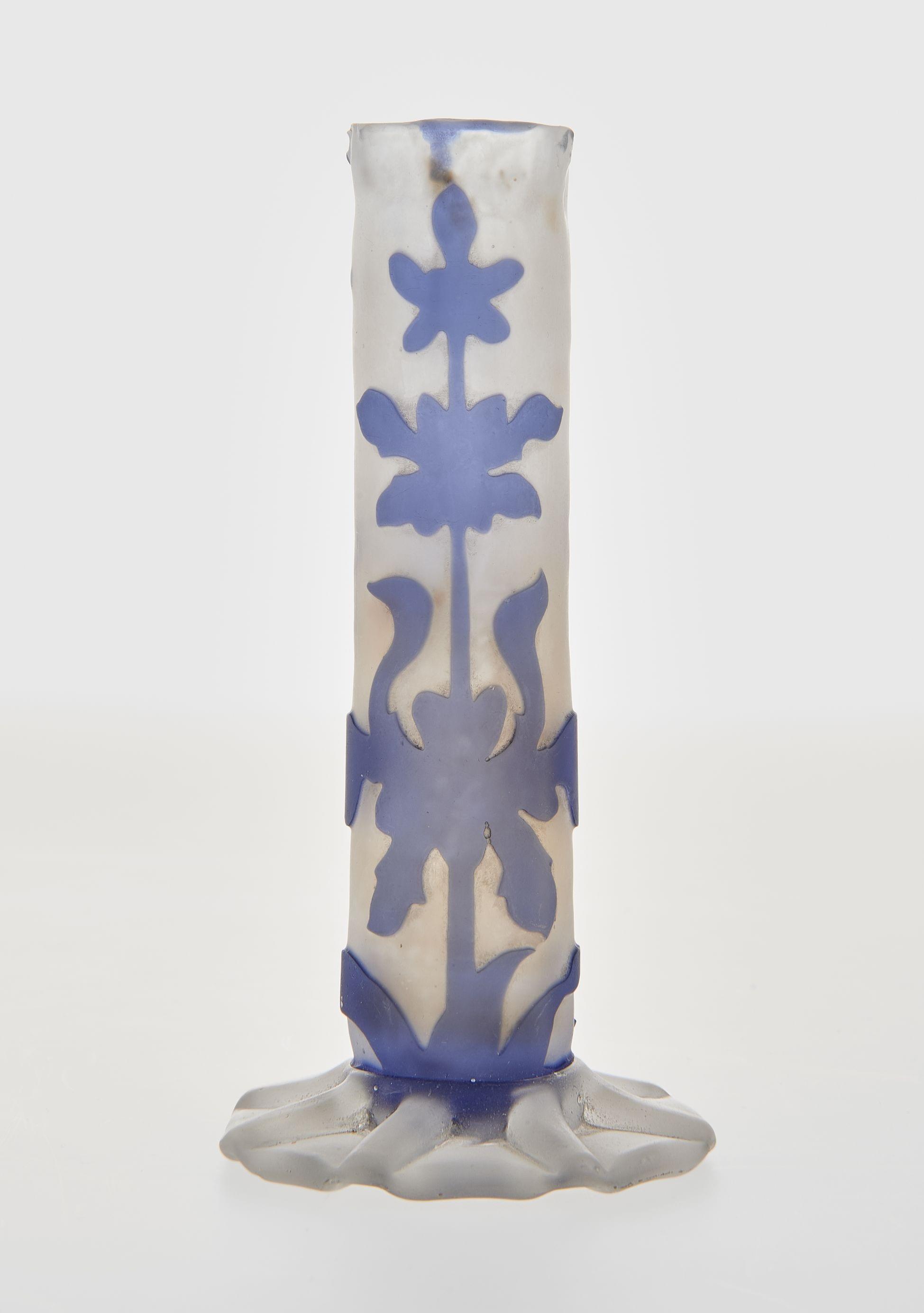 Verre multicouche dégagé à l'acide à décor de feuilles violettes sur fond laiteux, H 11 cm