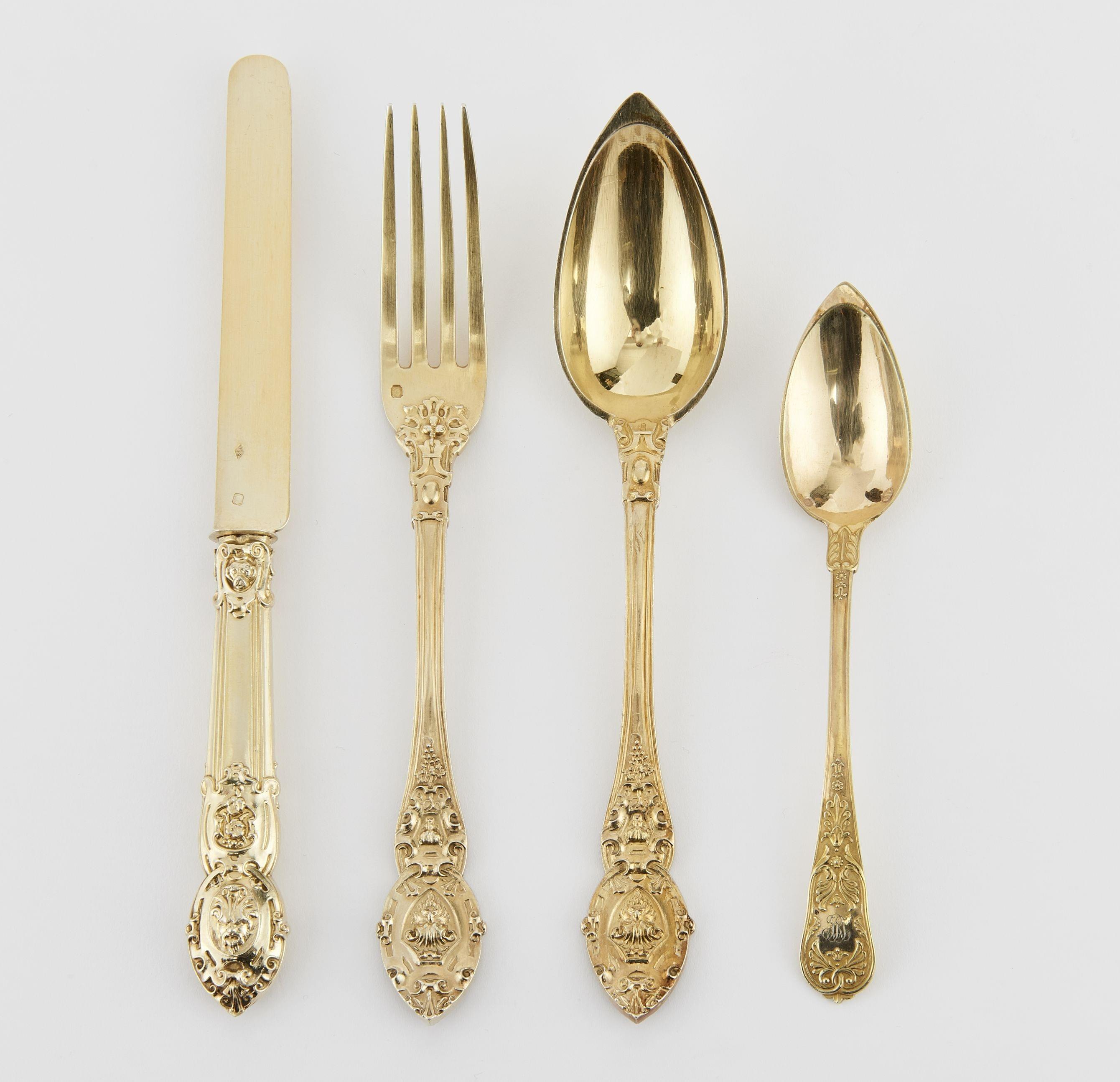 Vermeil, France, deuxième moitié du XIXe s, 880 g comprenant 8 fourchettes, 8 cuillères et 8 couteaux, 8 cuillères à café et une pince à sucre. Provenance: collection Pernet-Villaverde