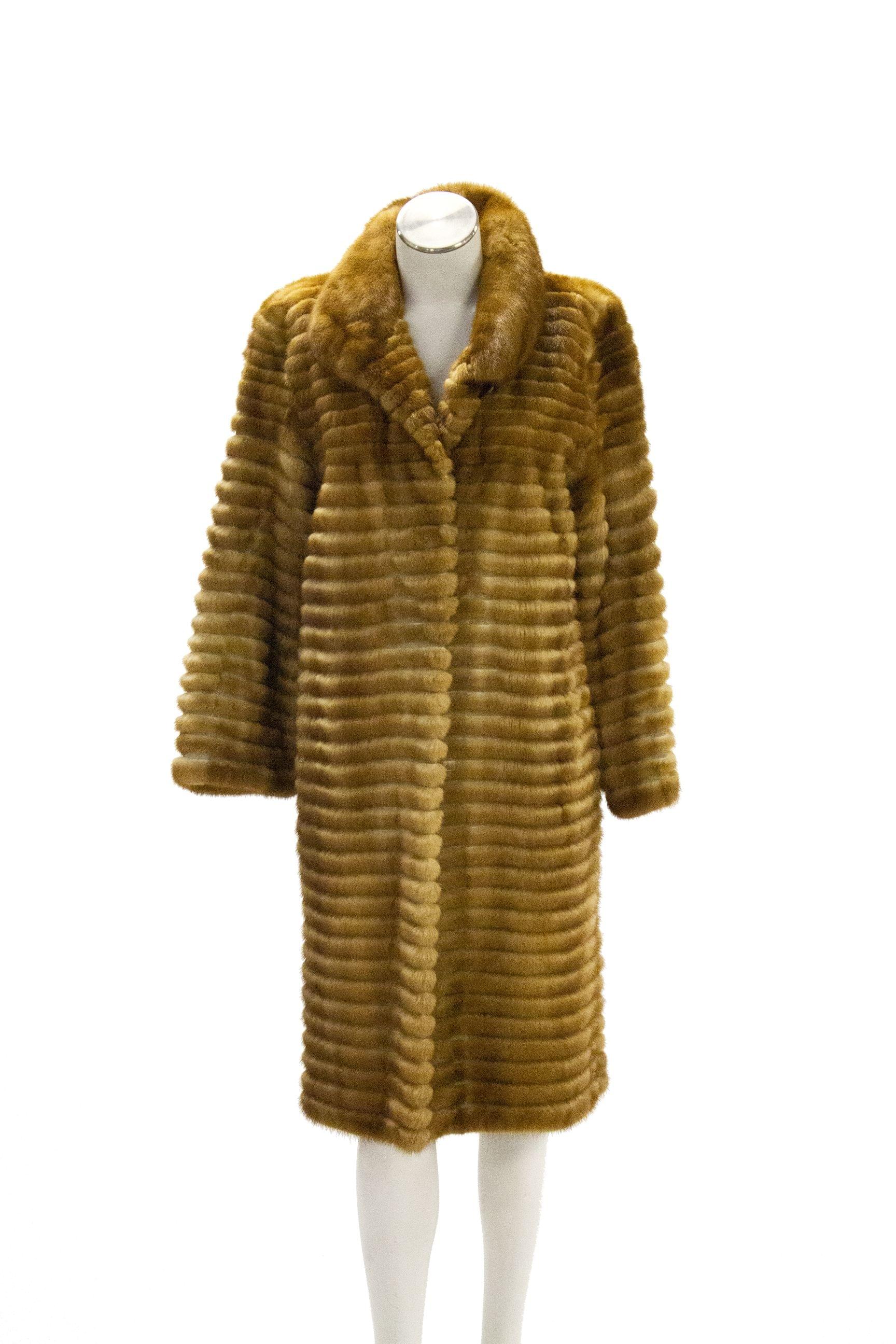 Fourrure brun clair, probablement renard, intérieur en soie ocre, poches latérales, fermetures à clips