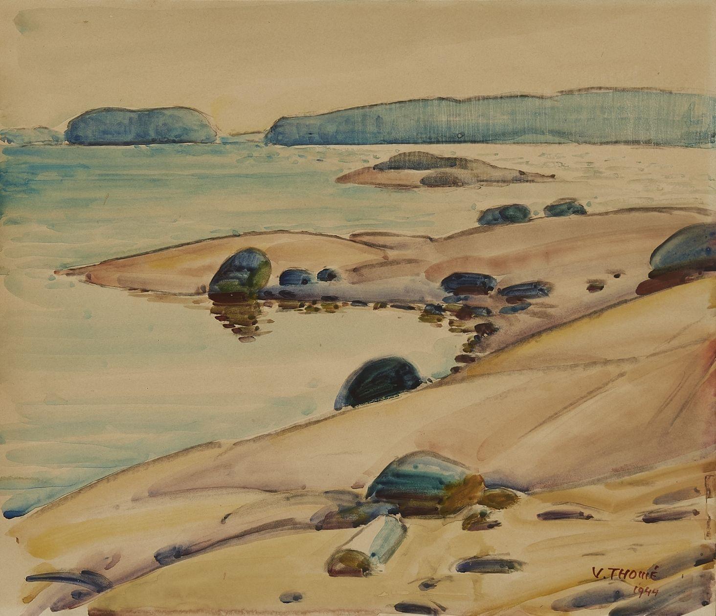 Paysage archipel du sud de la Finlande, aquarelle sur papier, signée et datée 1944, 32x37 cm