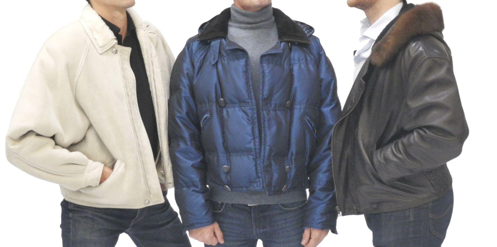 L'un en tissu bleu pétrole, col fourré noir, poches latérales, fermeture à boutons, T 50, l'un en cuir noir à capuche amovible bordée de fourrure, poches latérales, fermeture Eclaire, le dernier en mouton retourné beige, poches latérales, fermeture Eclaire. Provenance: collection Pernet-Villaverde