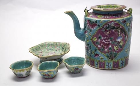 3290. Verseuse et 4 tasses à décor de fleurs