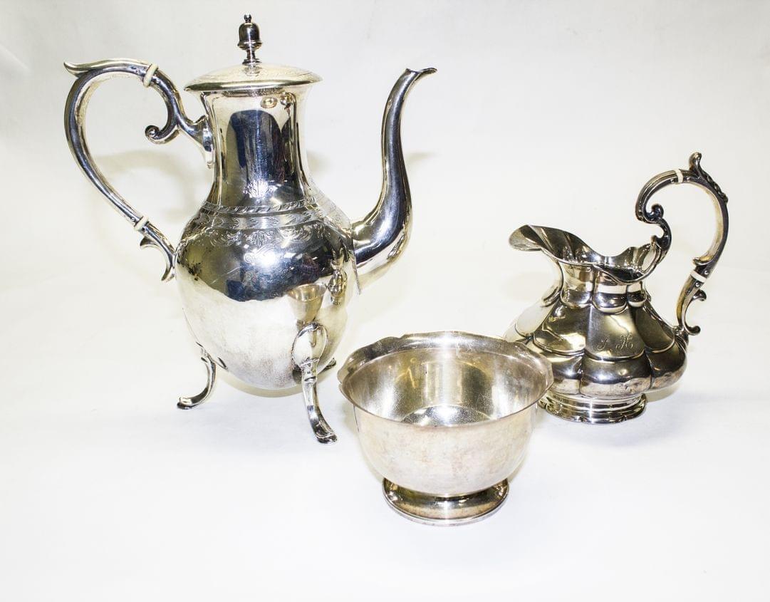 3357. Verseuse piriforme tripode gravée de lambrequins, crémier à larges côtes et sucrier sur talon