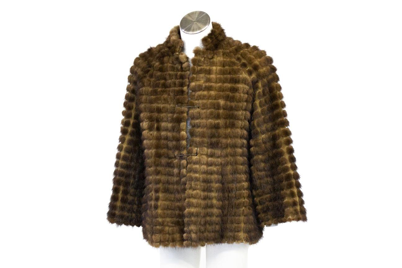 Fourrure probablement vison, intérieur en cachemire, fermeture à deux barrettes, deux poches latérales