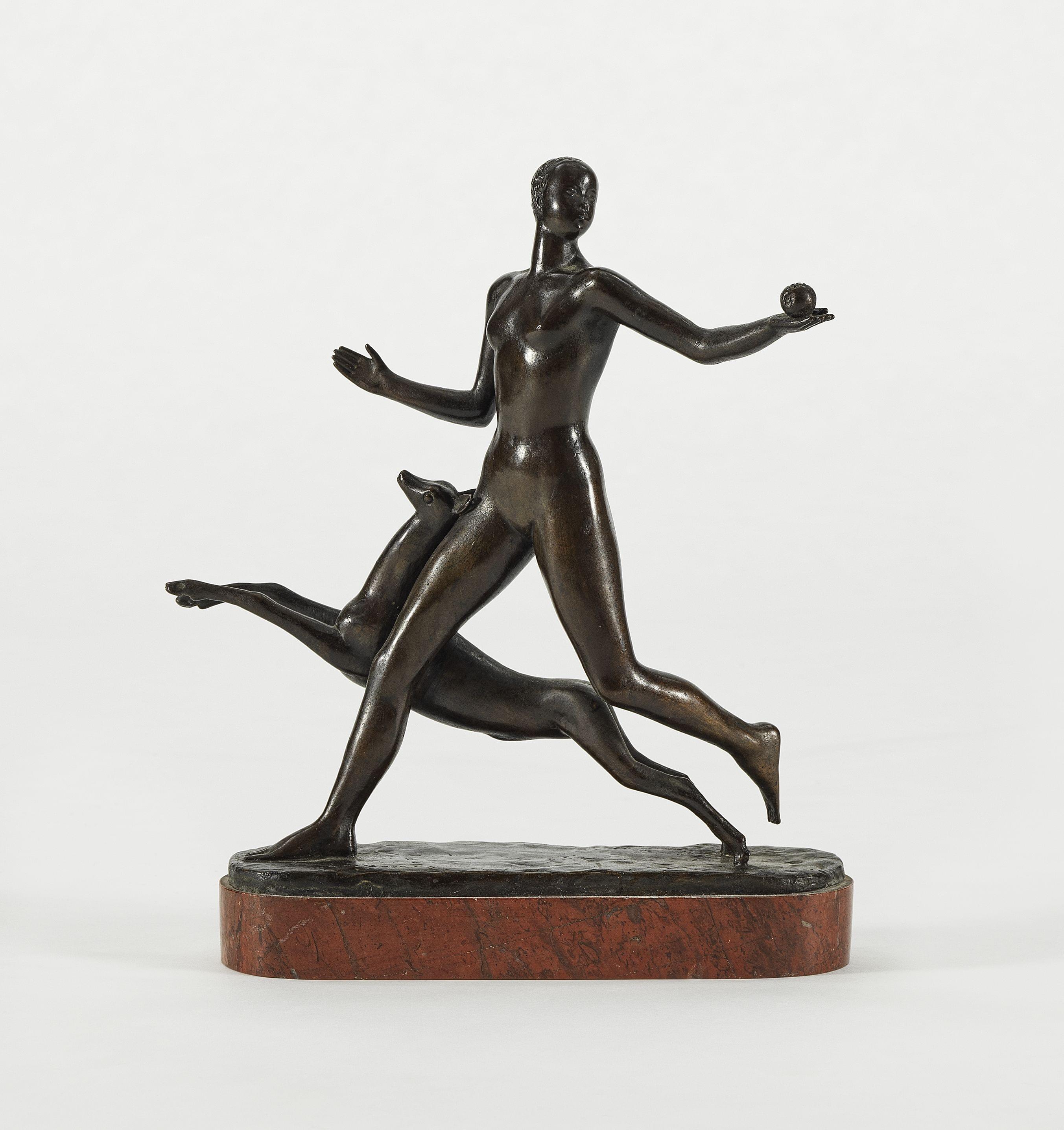Jeune homme nu et antilope, bronze à patine noire, H 30 cm