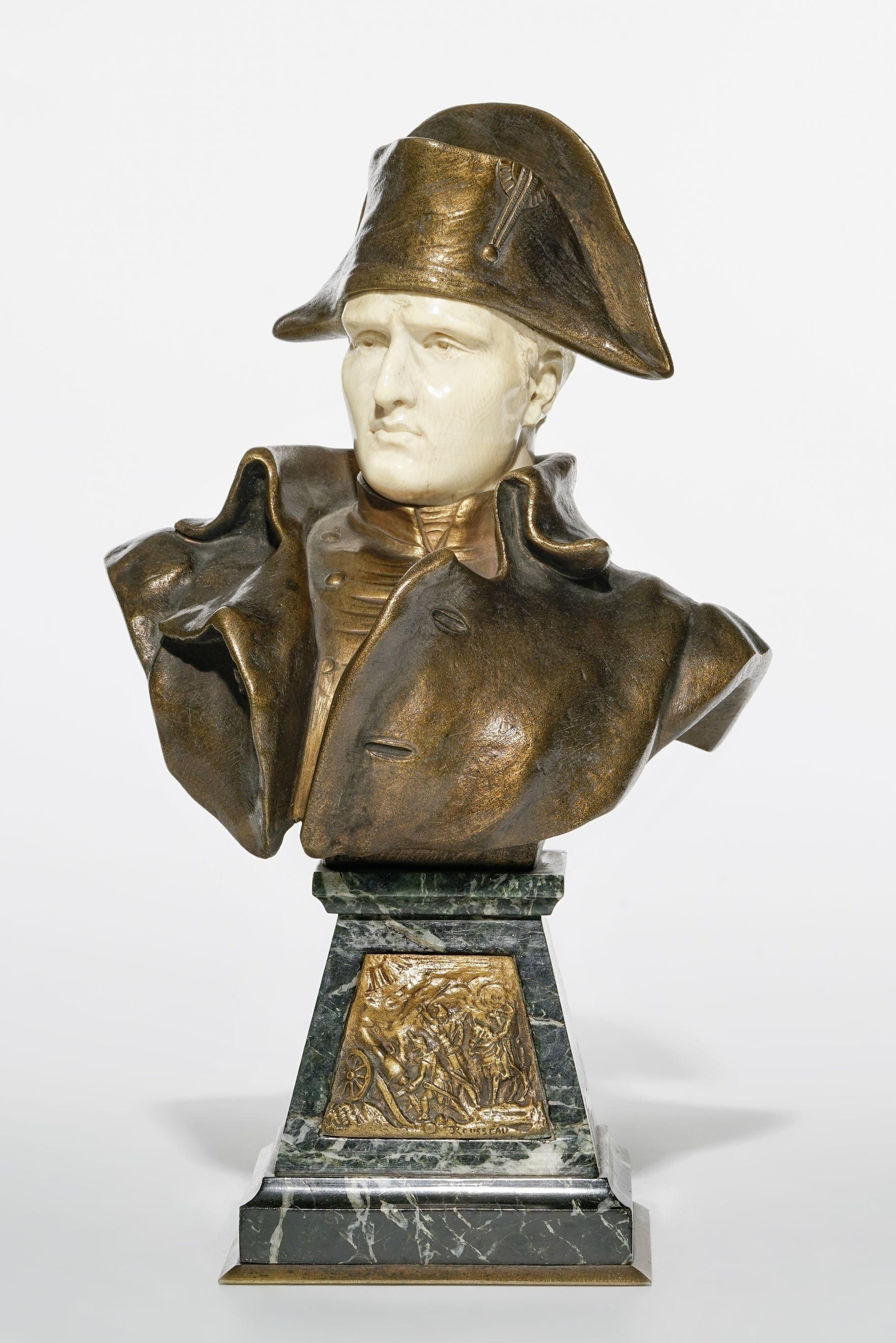 Napoléon en buste, sculpture chriséléphantine sur piètement en marbre, H 15 cm