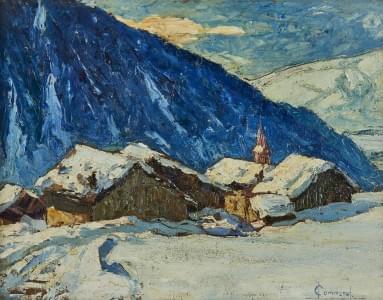Chalets sous la neige, huile sur carton, 26x34 cm
