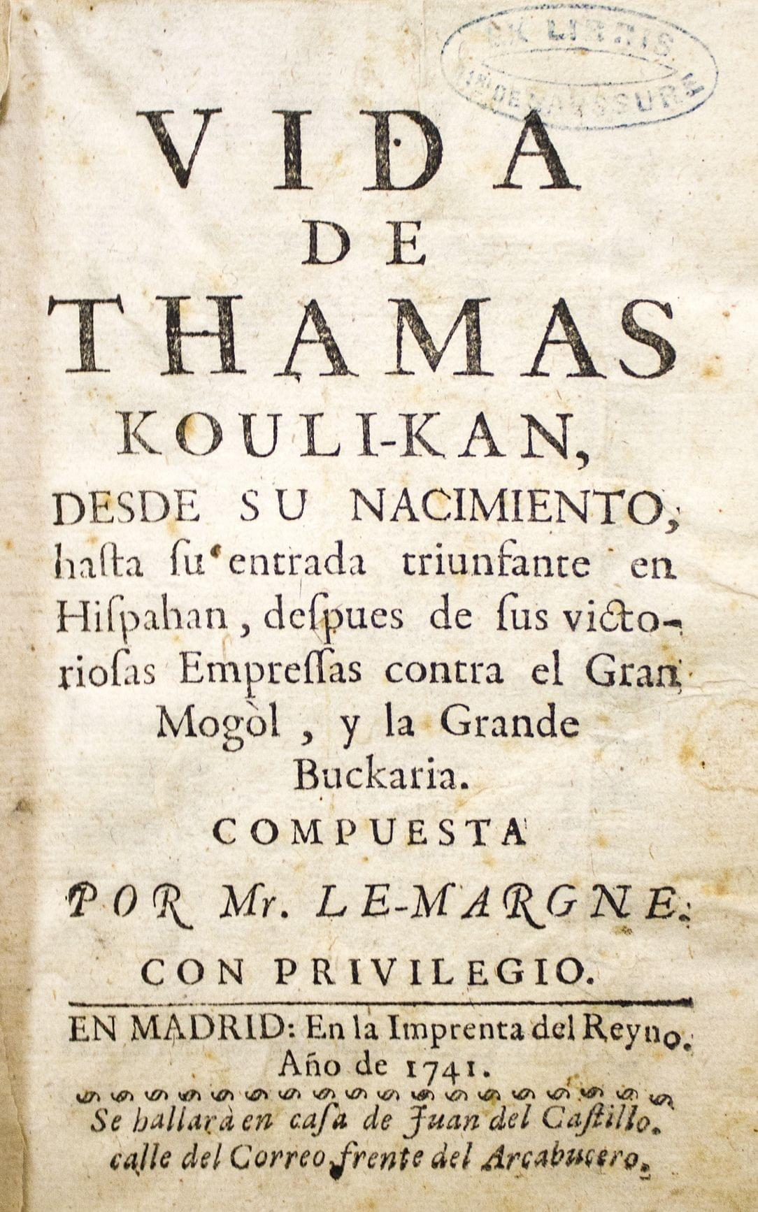 3732. Vida de Thamas Kouli Kan. Madrid, 1741;