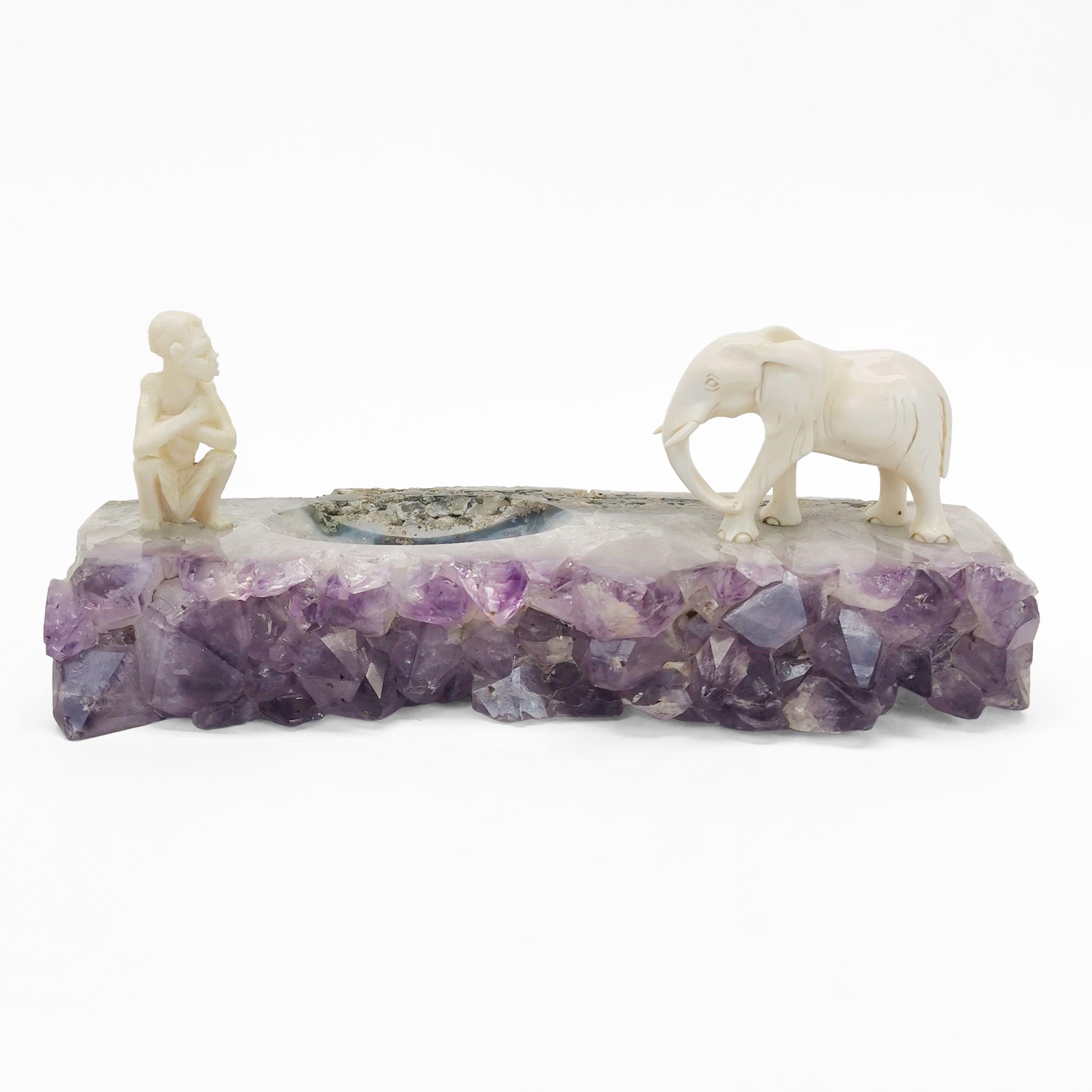 Améthyste polie surmontée d'un éléphant et d'une figurine en ivoire sculpté, L 22 cm