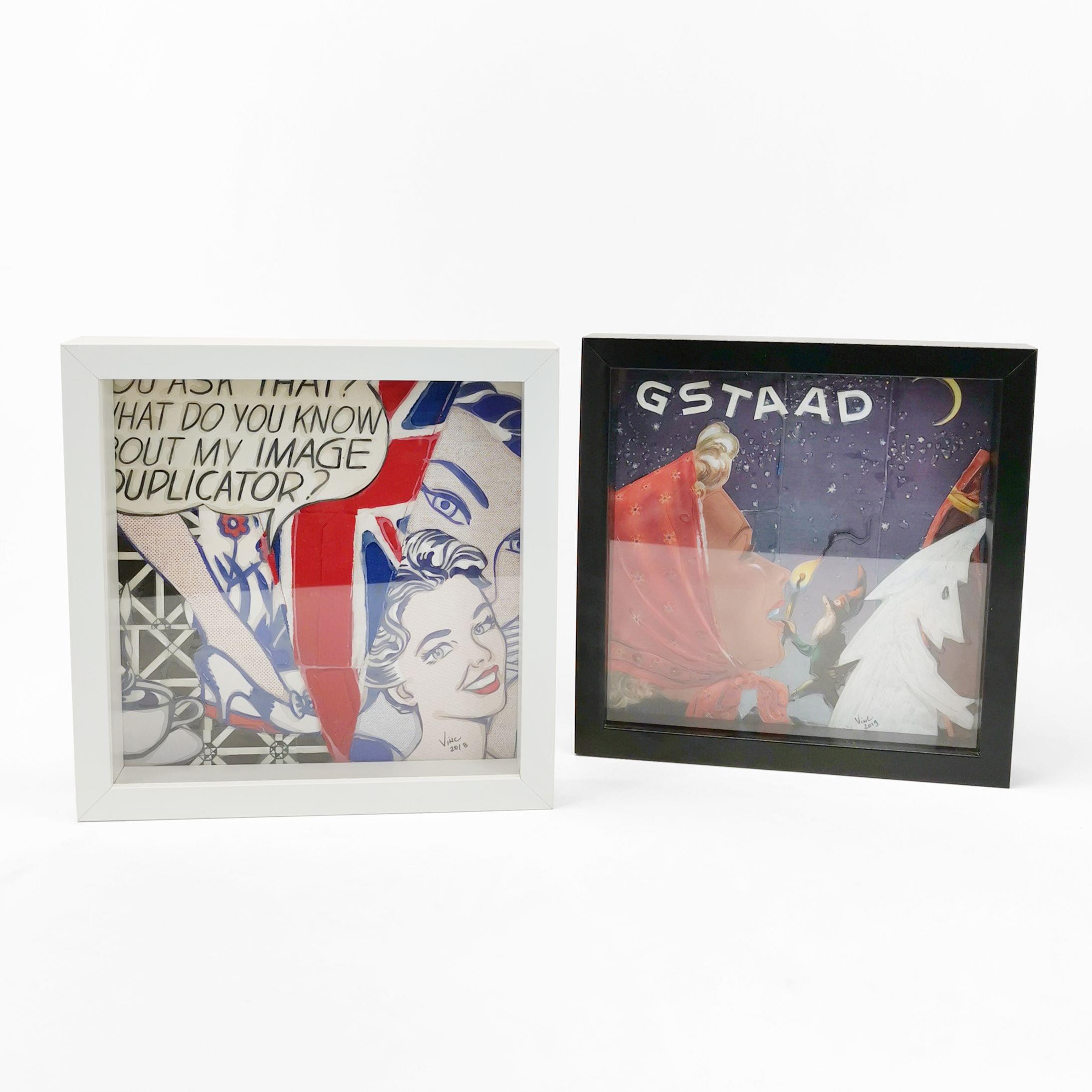Gstaad et Palace, deux collages sur pavatex, signés et datés 202...