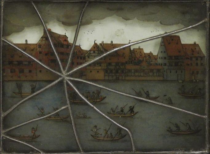 4231. Vitrail figurant une scène de joute fluviale